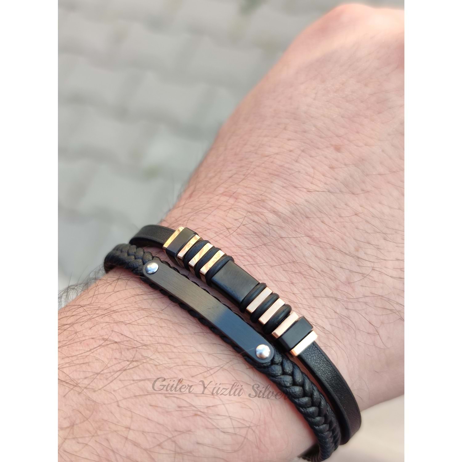 ROSE DETAYLI İKİ SIRA PLAKA DERİ ÇELİK ERKEK BİLEKLİK