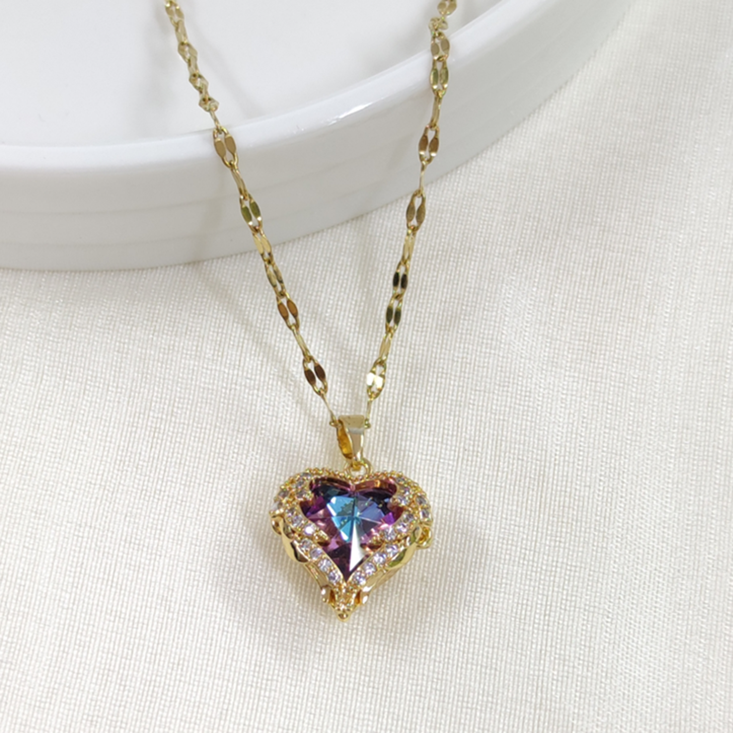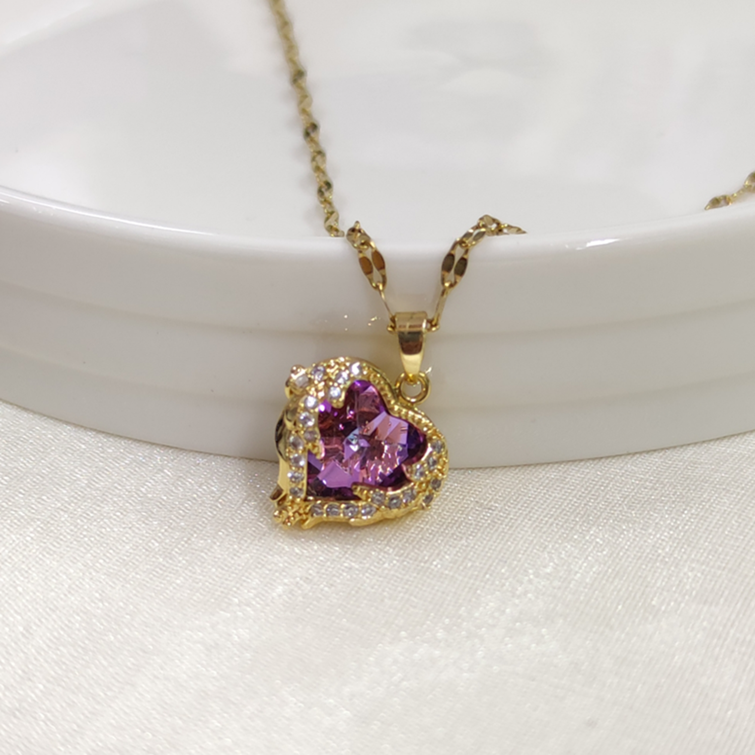 ÇELİK MOR TAŞLI KALP KOLYE 1,5 CM