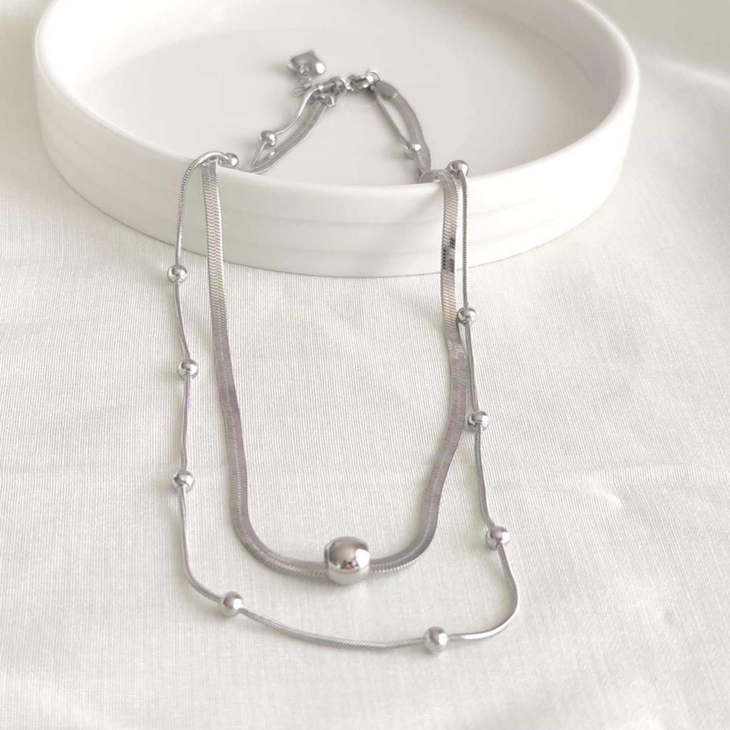 ÇELİK YASSI VE TOP ZİNCİR KOMBİN İKİLİ KOLYE - BEYAZ
