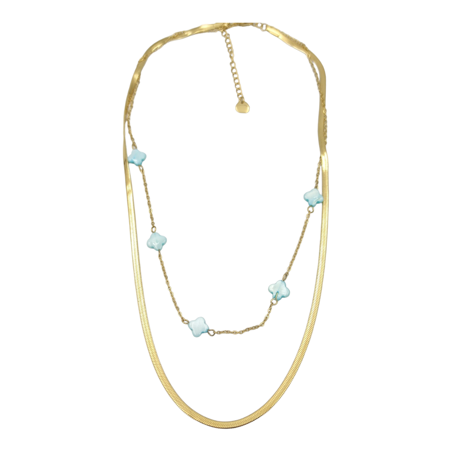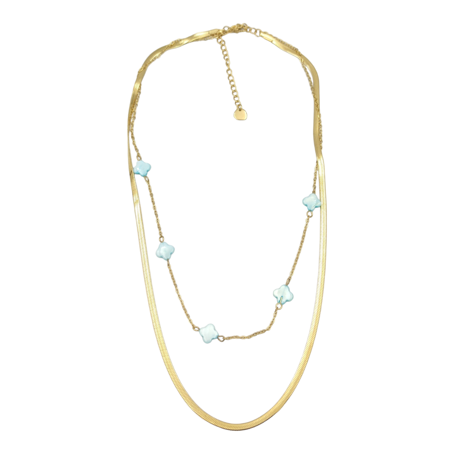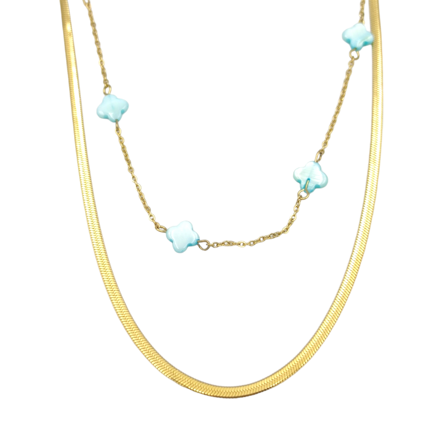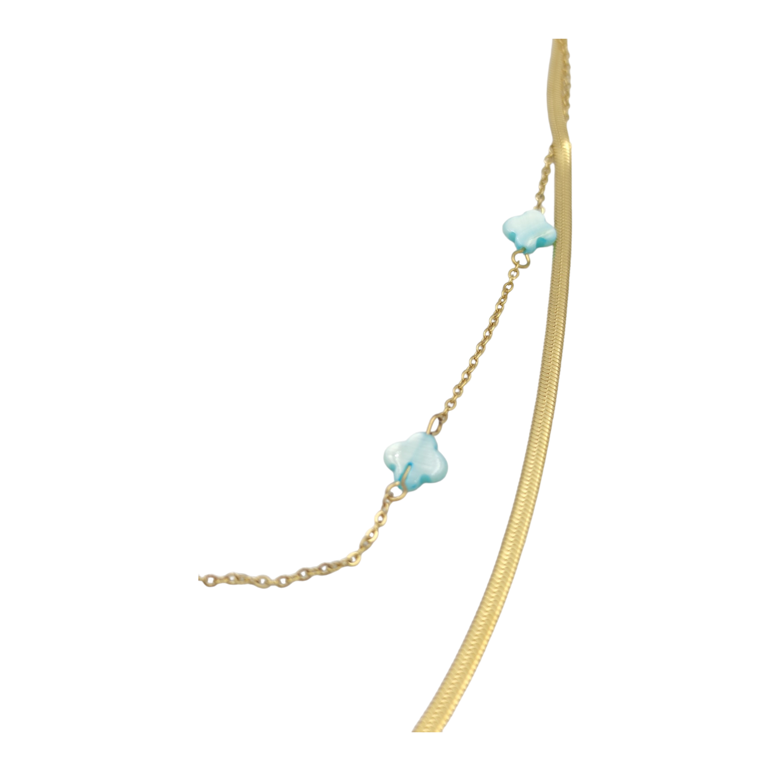 ÇELİK YASSI ZİNCİRLİ İKİLİ KOMBİN BUZ MAVİ YONCA KOLYE