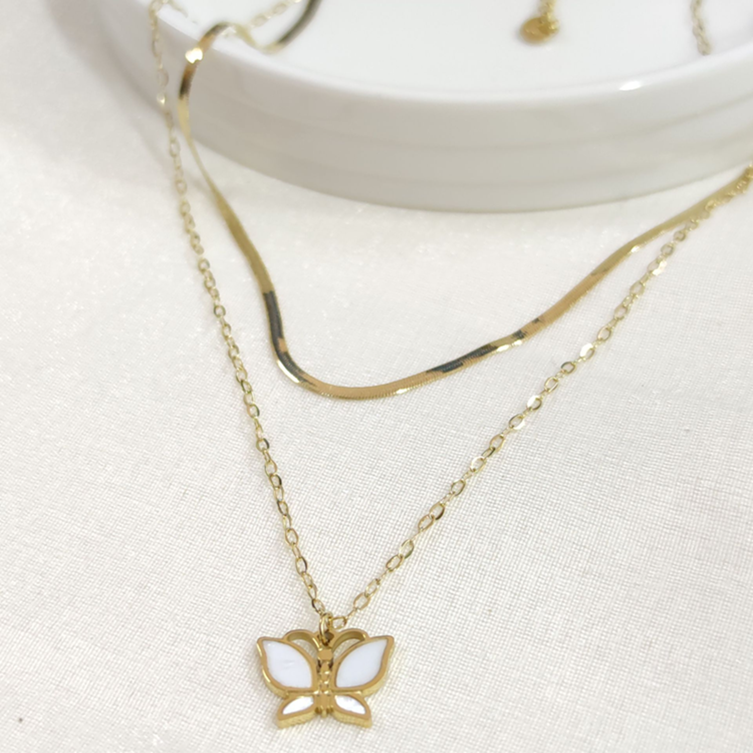 ÇELİK YASSI ZİNCİRLİ SEDEF KELEBEK KOMBİN İKİLİ KOLYE