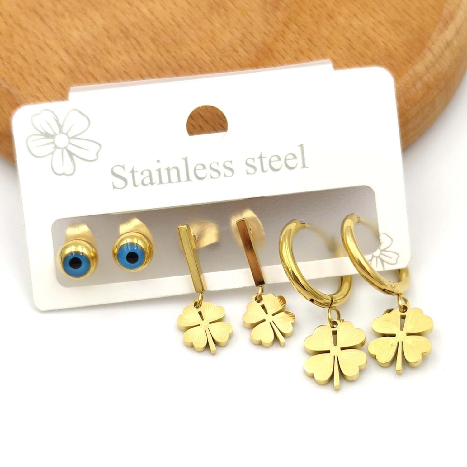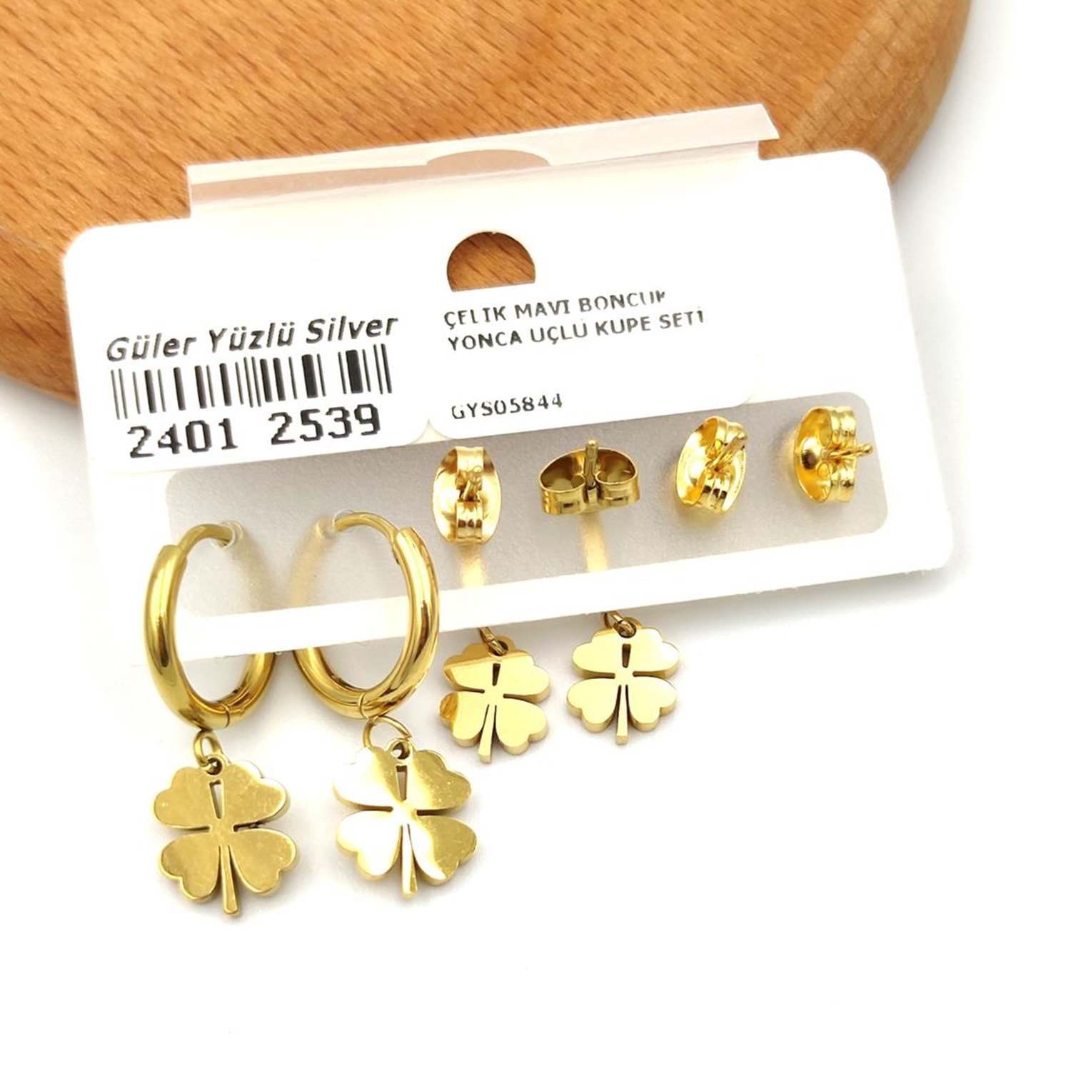 ÇELİK MAVİ BONCUK YONCA ÜÇLÜ KÜPE SETİ