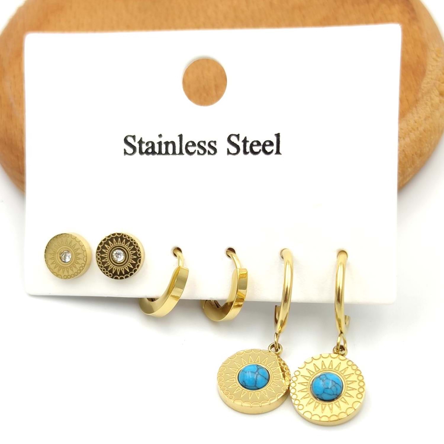 ÇELİK MAVİ TAŞLI YUVARLAK ÜÇLÜ KÜPE SETİ