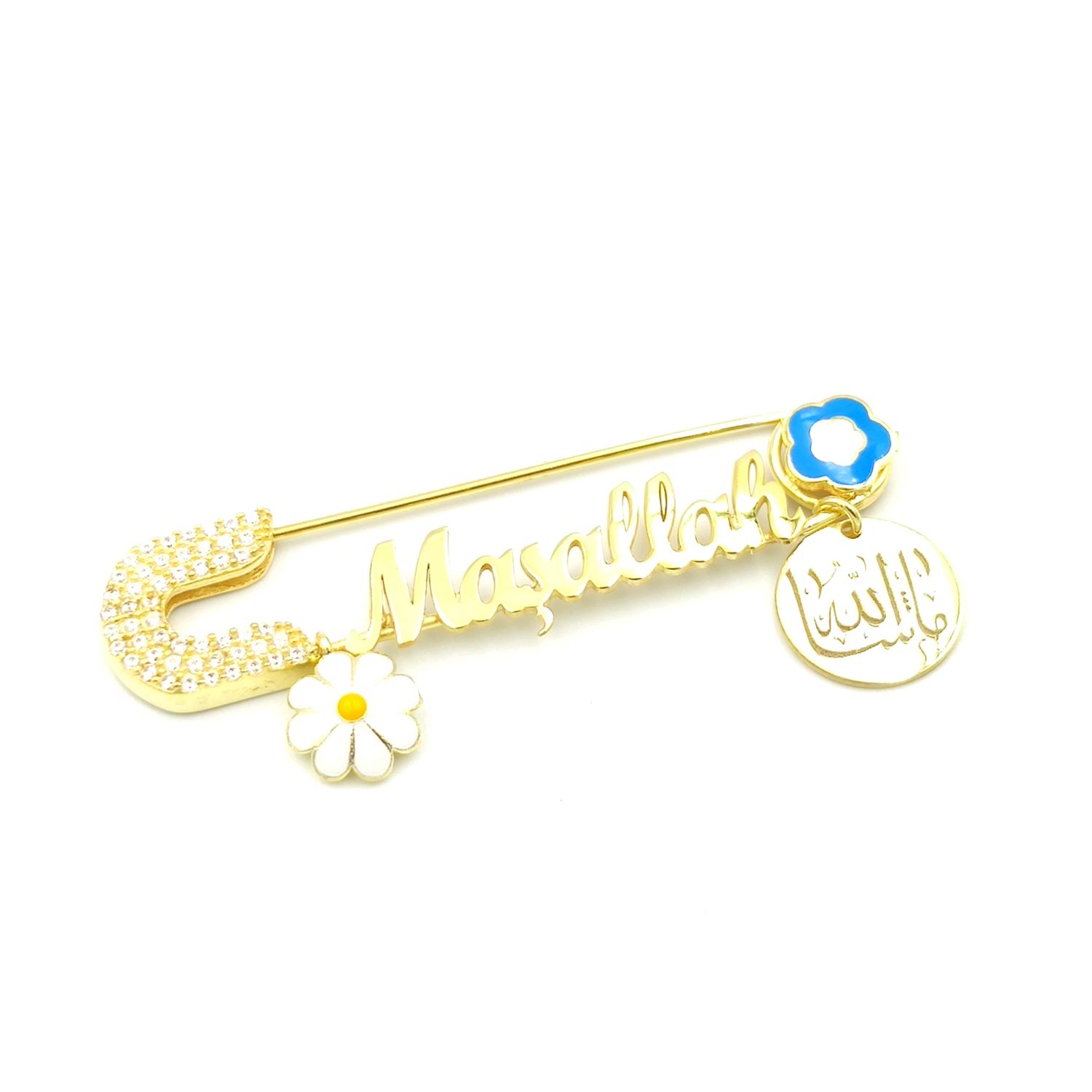 MAŞALLAH YAZILI MAVİ MİNE PAPATYA GÜMÜŞ BEBEK İĞNESİ