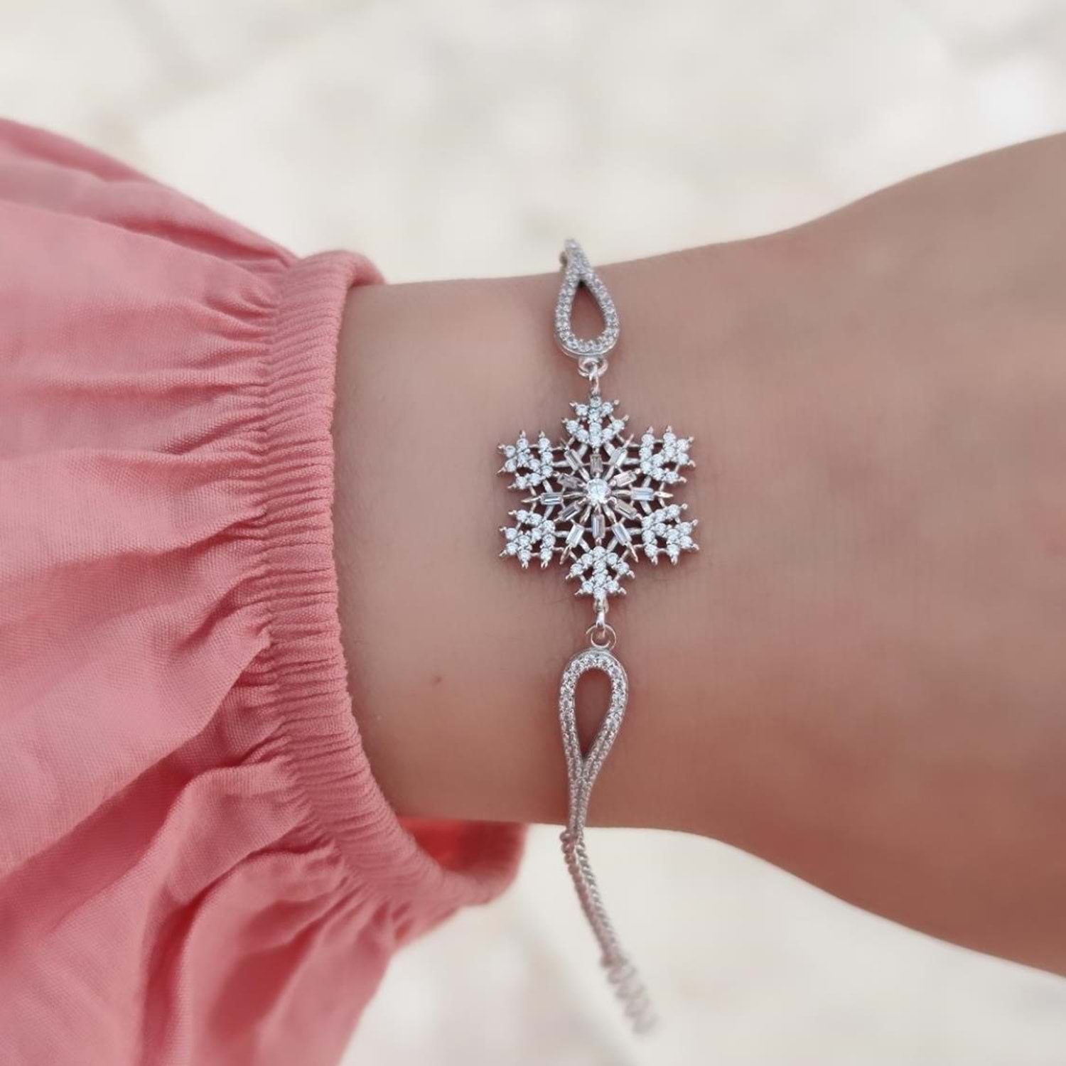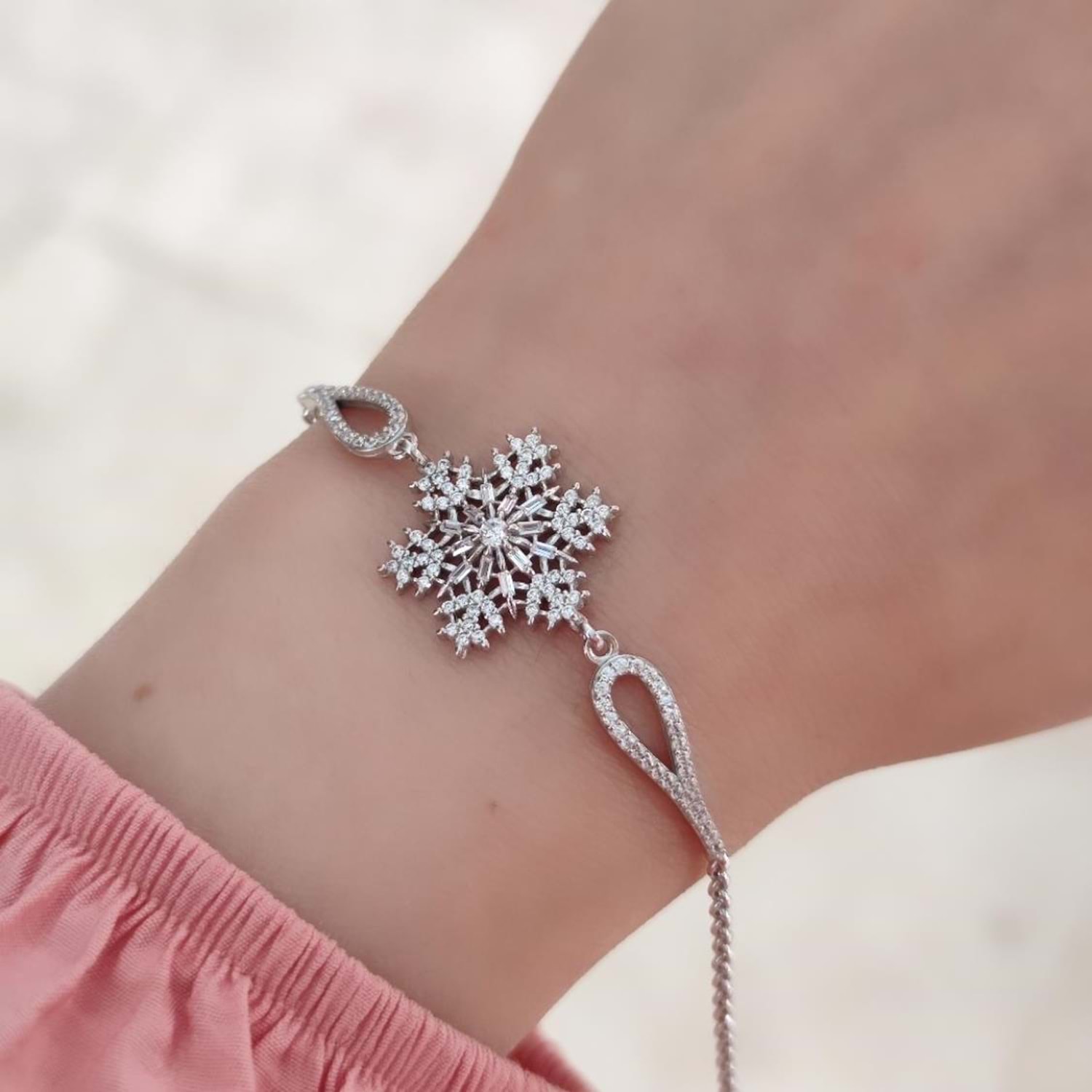925 AYAR GÜMÜŞ UZUNLUK : 16,5 CM + 3 CM EK UZATMA HALKASI MEVCUTTUR. ORT GRAM : 5,17 CM KAR TANE BOYUTU : 2 CM ÇAPINDA ZİRKON TAŞ KULLANILMIŞTIR.
