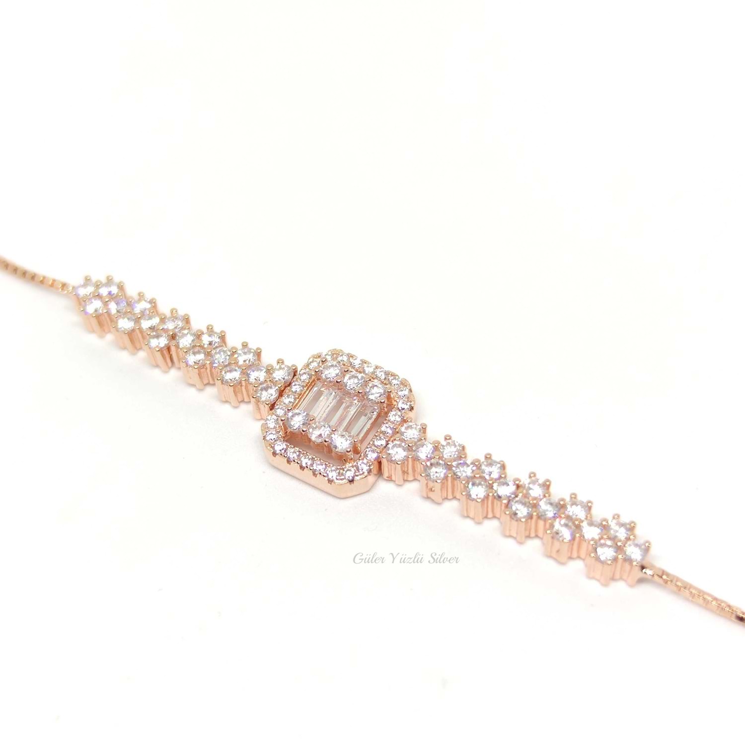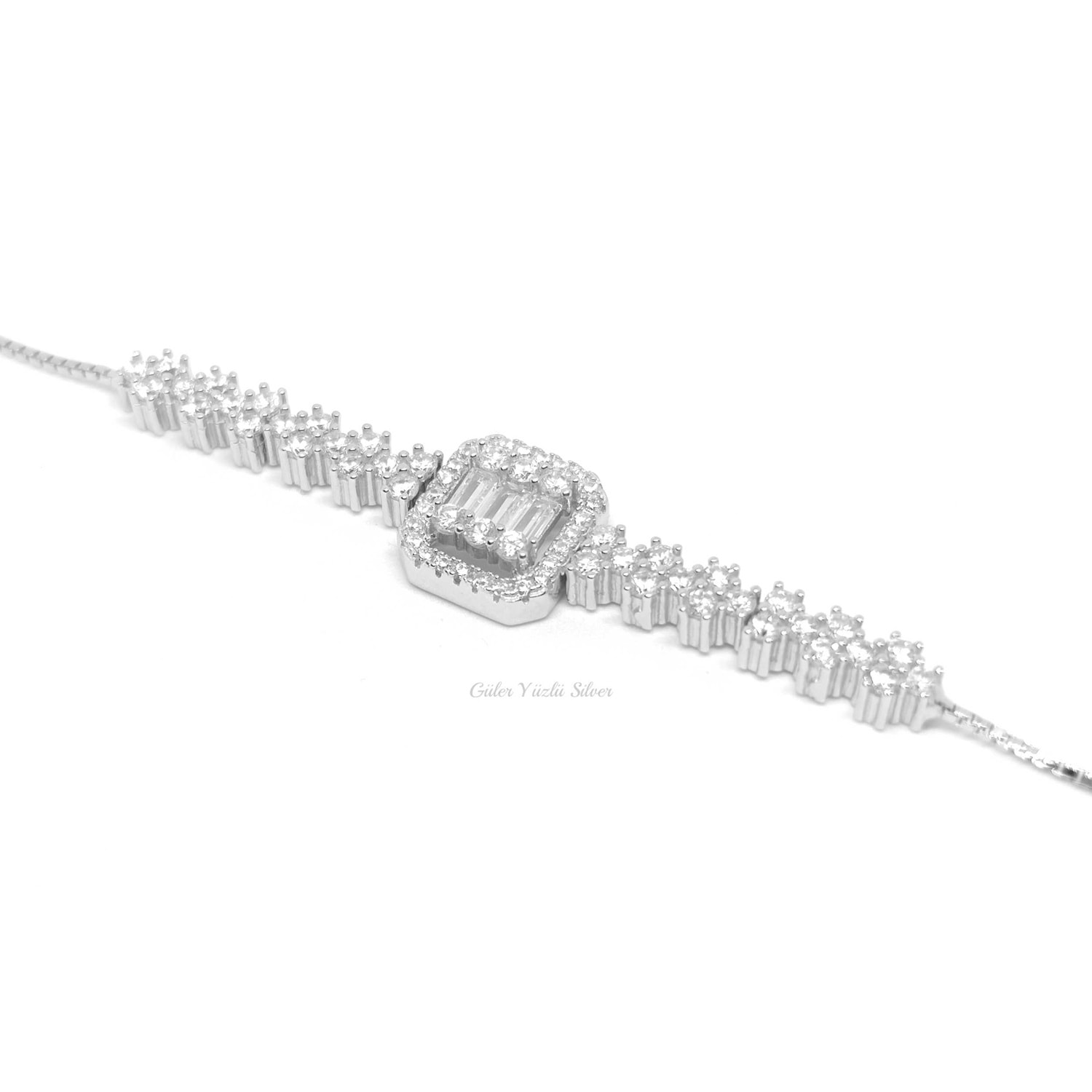 925 AYAR GÜMÜŞ ORTALAMA GRAM : 7,70 GR UZUNLUK : 17 CM + 3 CM EK UZATMA HALKASI VARDIR. PIRIL PIRIL PIRLANTA MONTÜR BAGET GÜMÜŞ BİLEKLİK