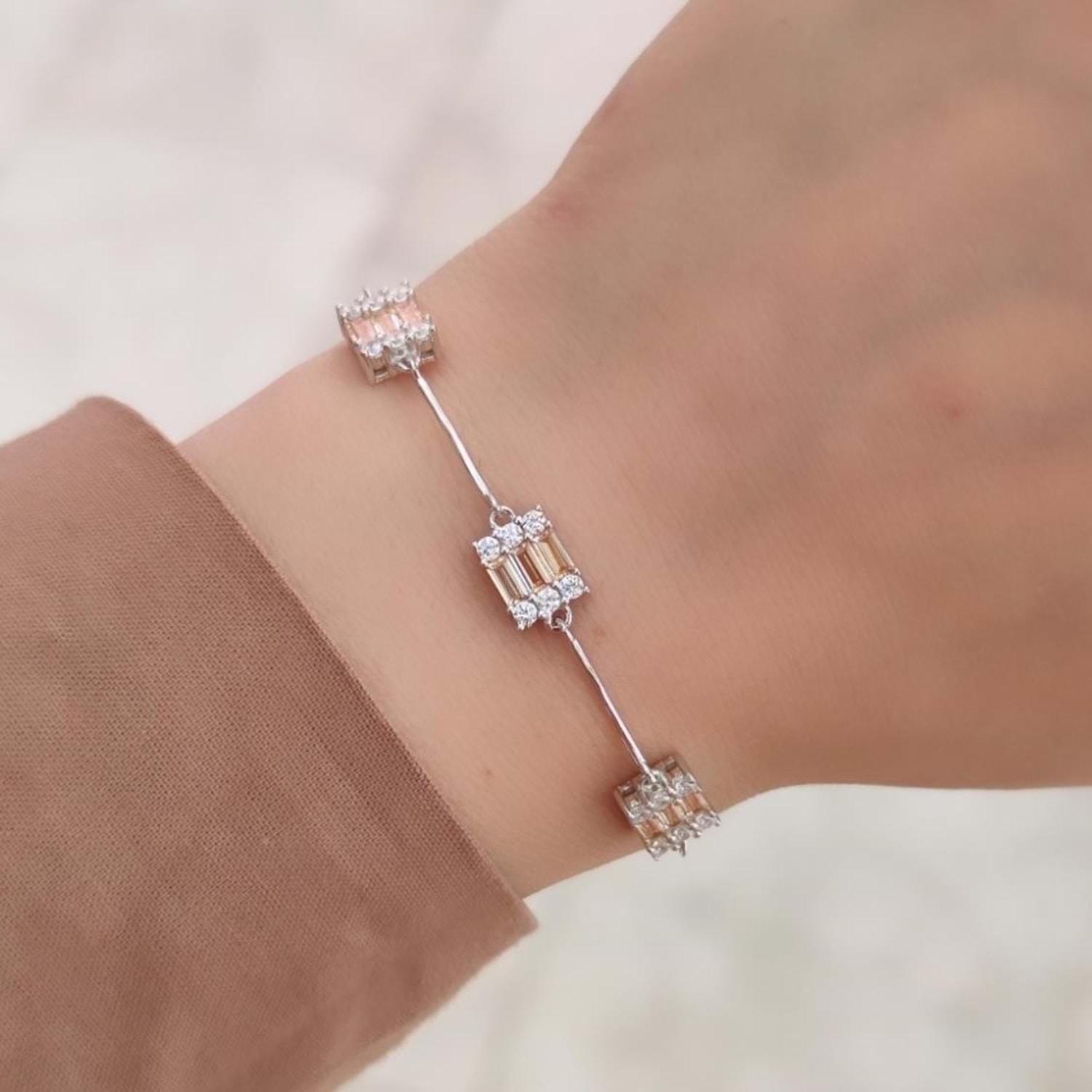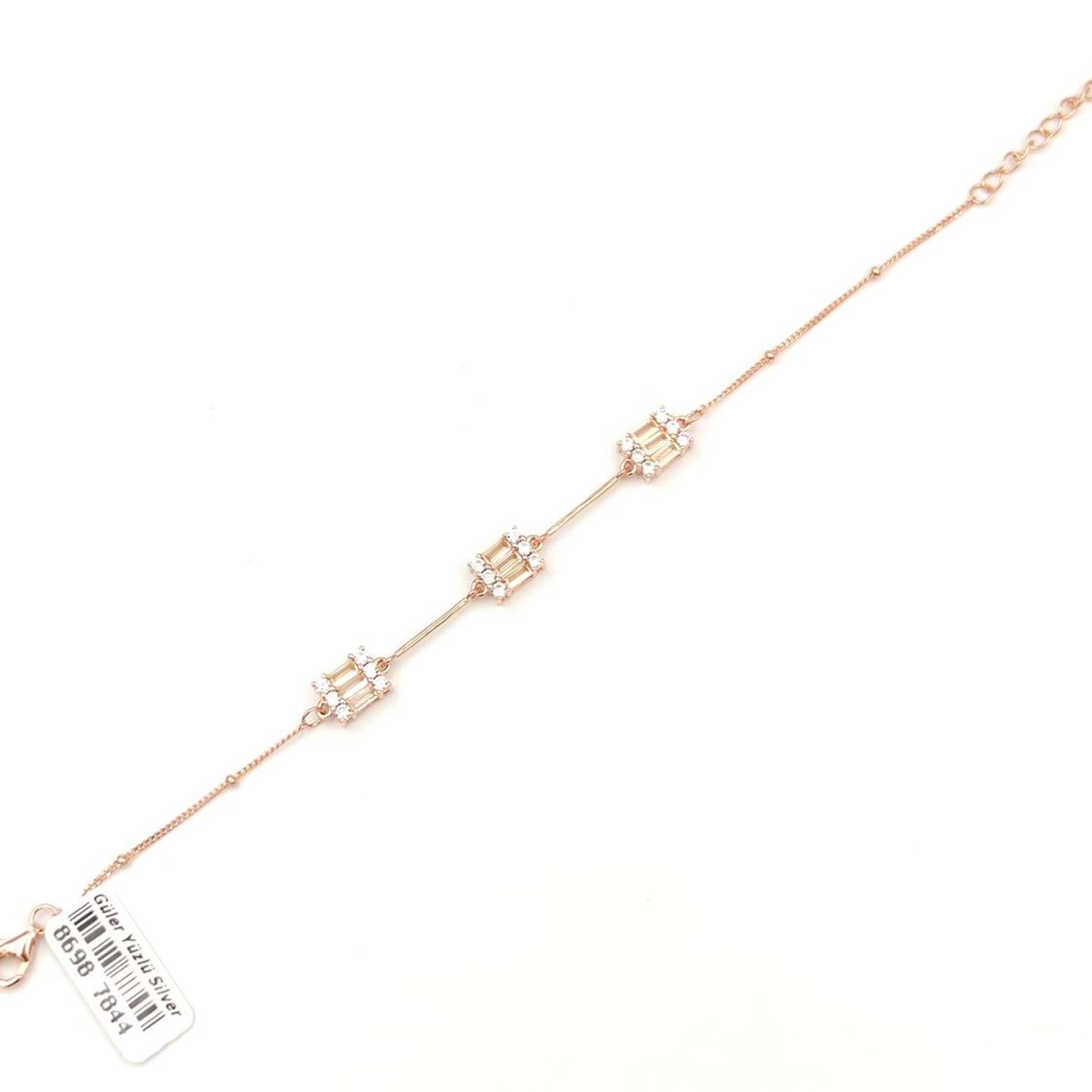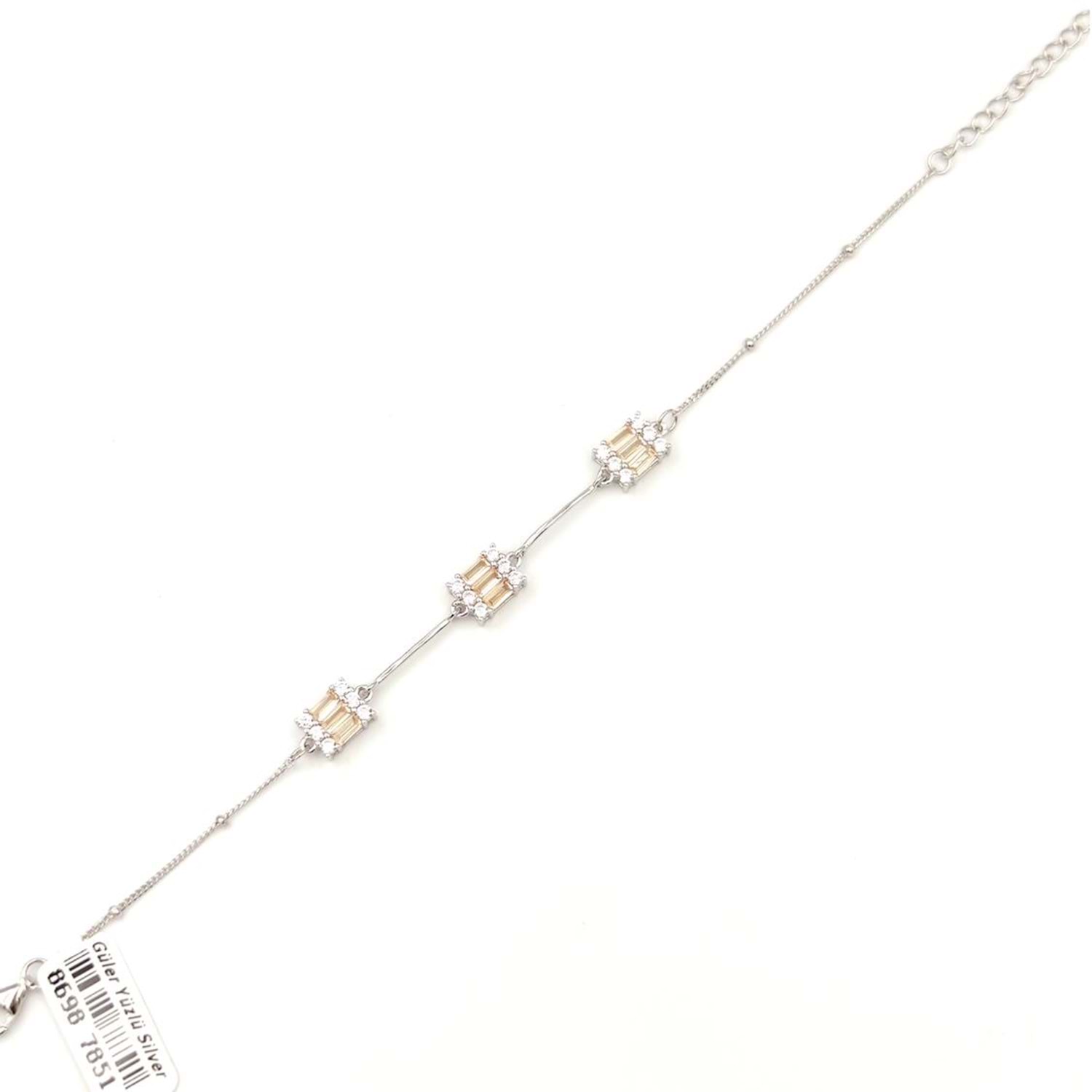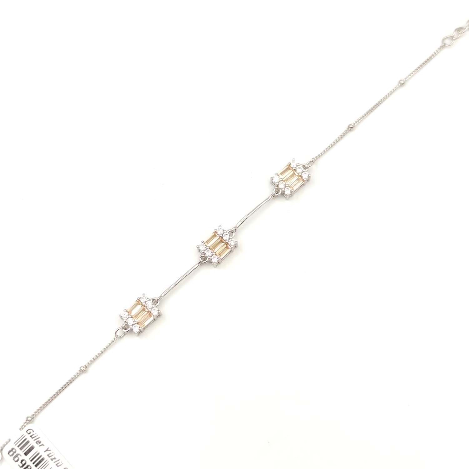 925 AYAR GÜMÜŞ ORT GRAM : 3,85 gr UZUNLUK : 17CM + 3 CM EK UZATMA HALKASI MEVCUTTUR. BAGET BOYUTU : 7*9MM BAGET TAŞLARINDA PIRLANTA MONTÜR SARI ZİRKON TAŞ KULLANILMIŞTIR.