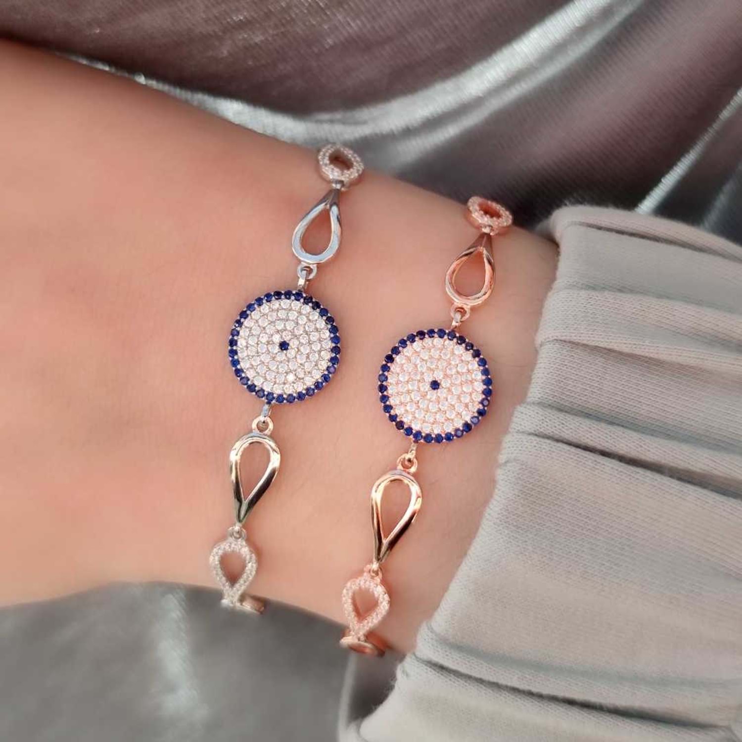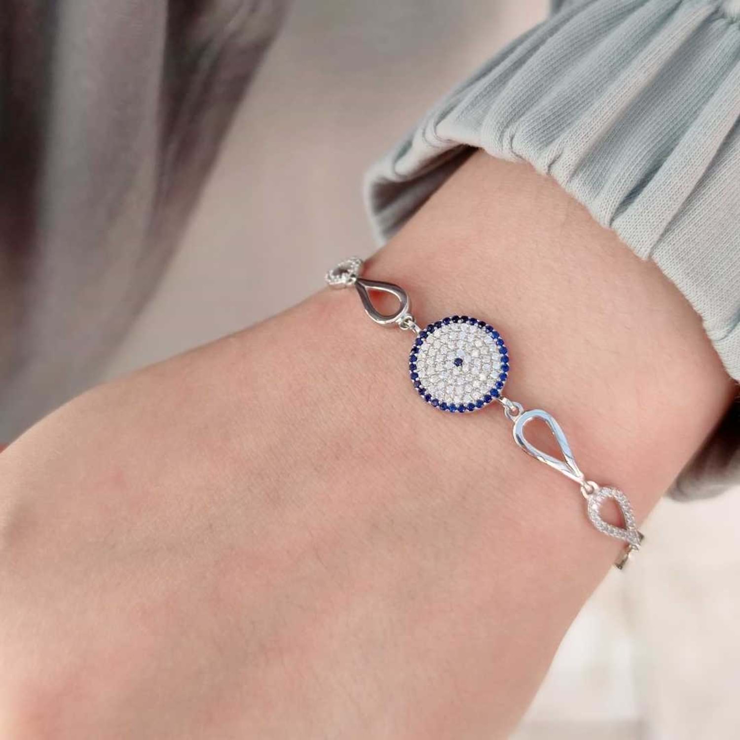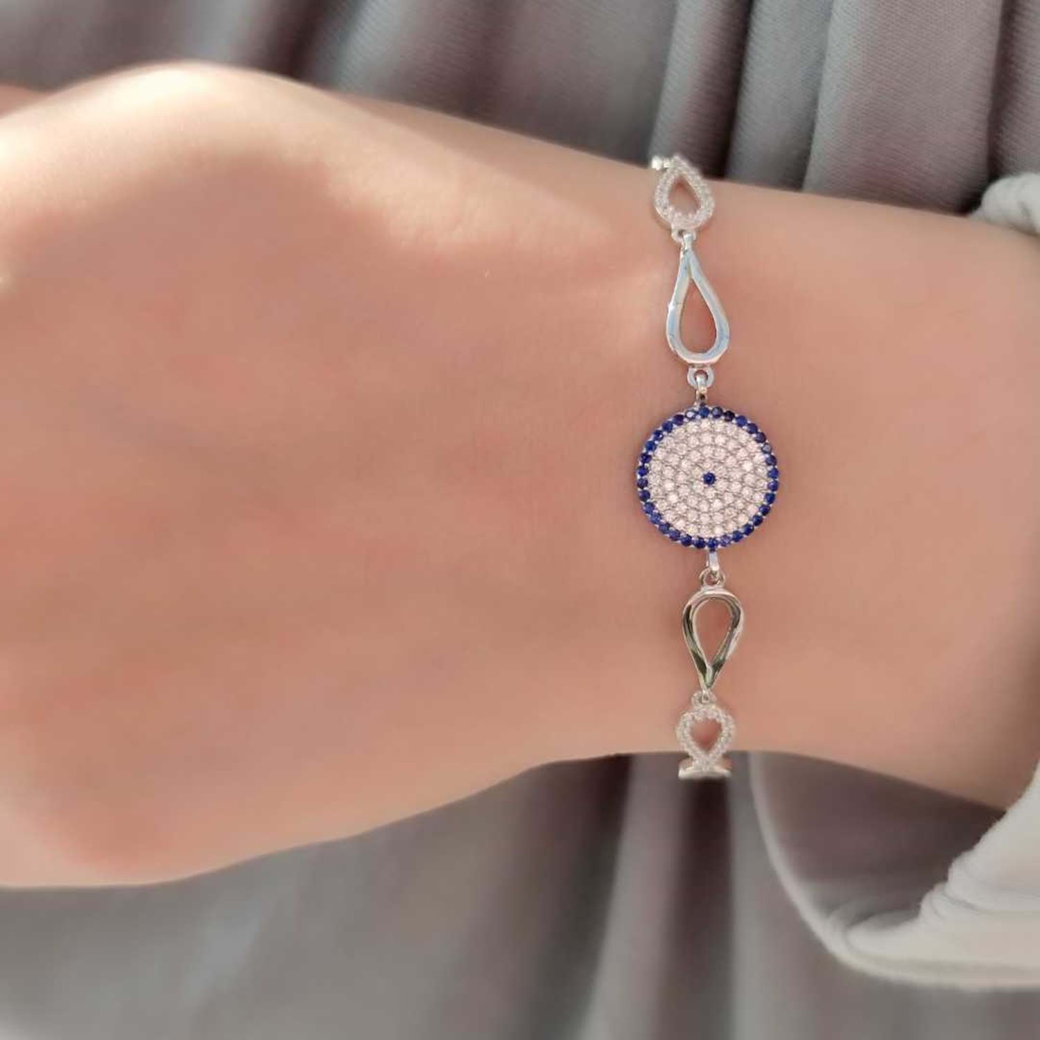 925 AYAR GÜMÜŞ NAZAR BONCUK SOSYETE GÖZÜ GÜMÜŞ BİLEKLİK ZİRKON TAŞ KULLANILMIŞTIR. ORT. GRAM : 6,17 gr BİLEKLİK UZUNLUK : 17 cm + 2,5 cm EK UZATMA HALKASI KİMYASAL ÜRÜNLERLE TEMASINDAN KAÇINILMALIDIR.