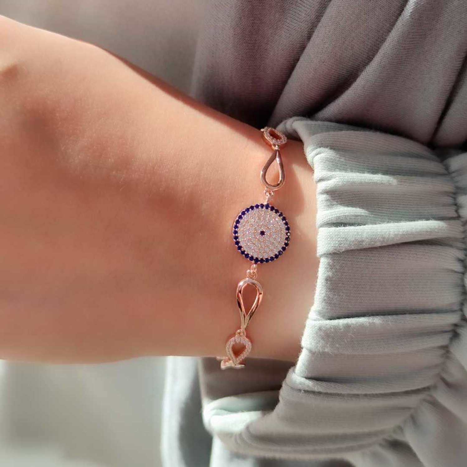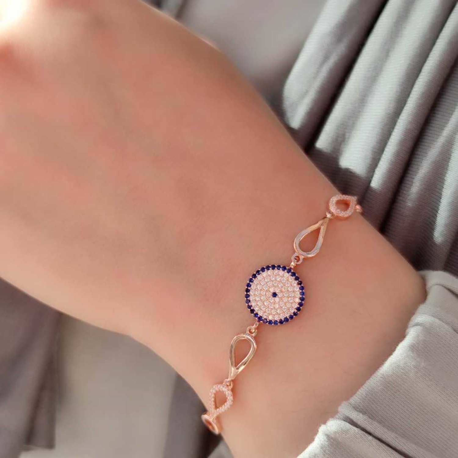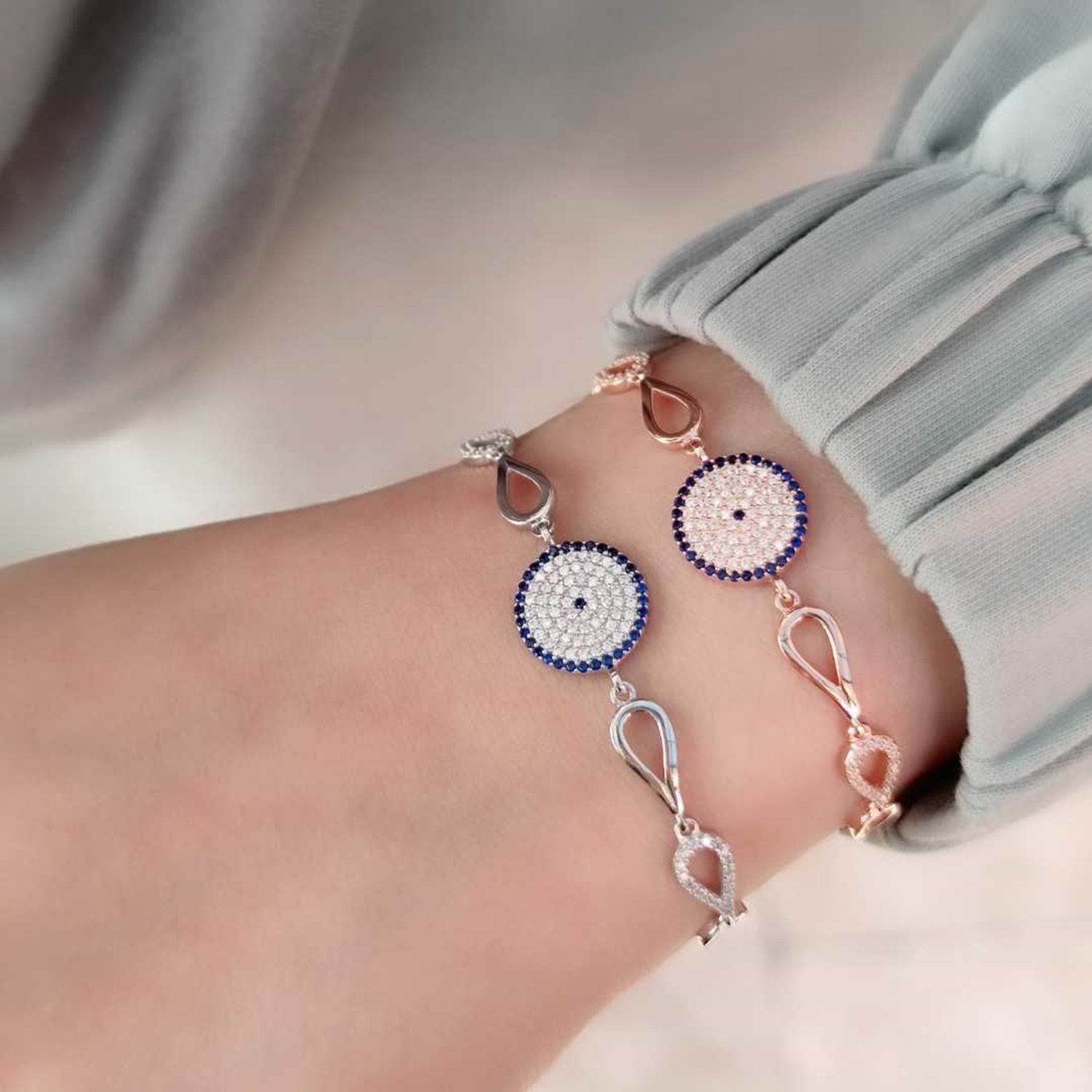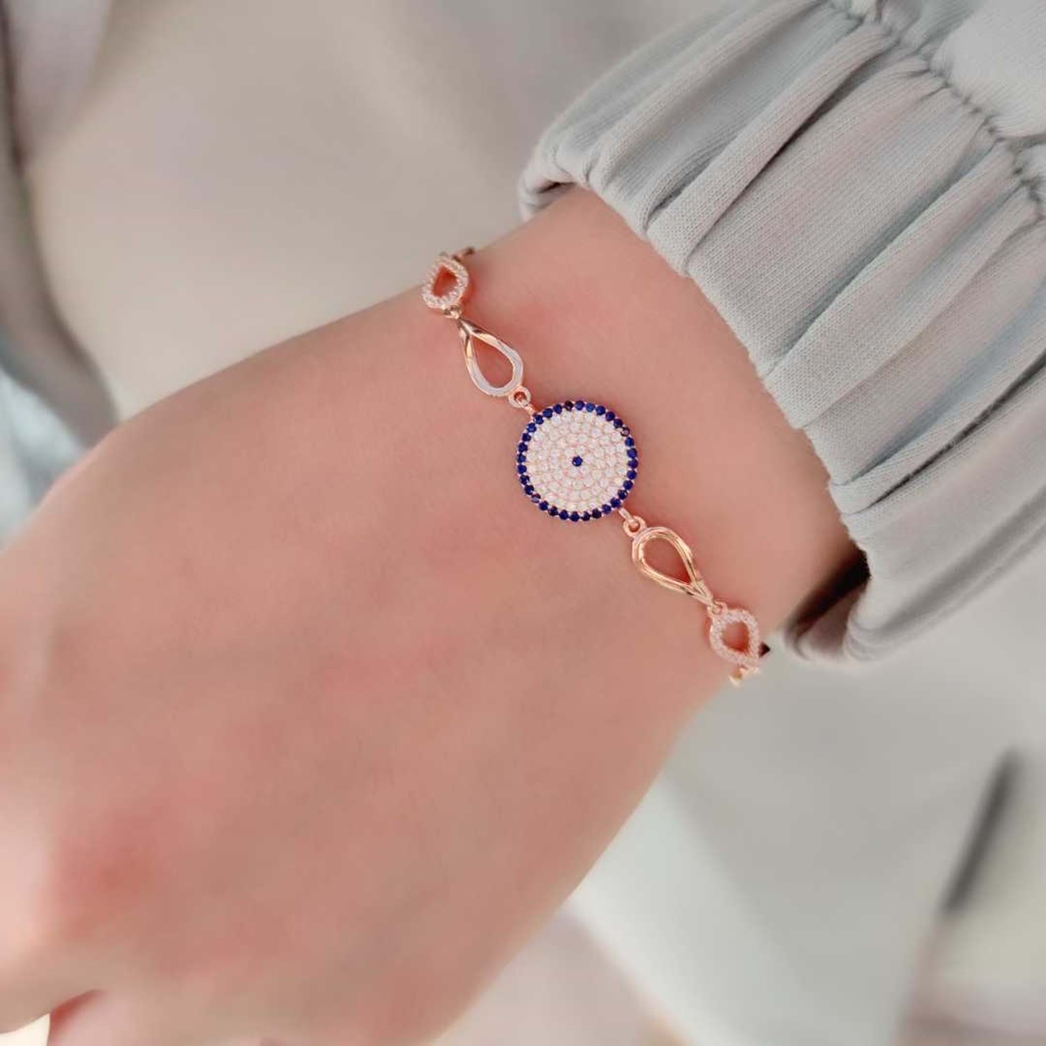 925 AYAR GÜMÜŞ NAZAR BONCUK SOSYETE GÖZÜ GÜMÜŞ BİLEKLİK ZİRKON TAŞ KULLANILMIŞTIR. ORT. GRAM : 6,17 gr BİLEKLİK UZUNLUK : 17 cm + 2,5 cm EK UZATMA HALKASI KİMYASAL ÜRÜNLERLE TEMASINDAN KAÇINILMALIDIR.
