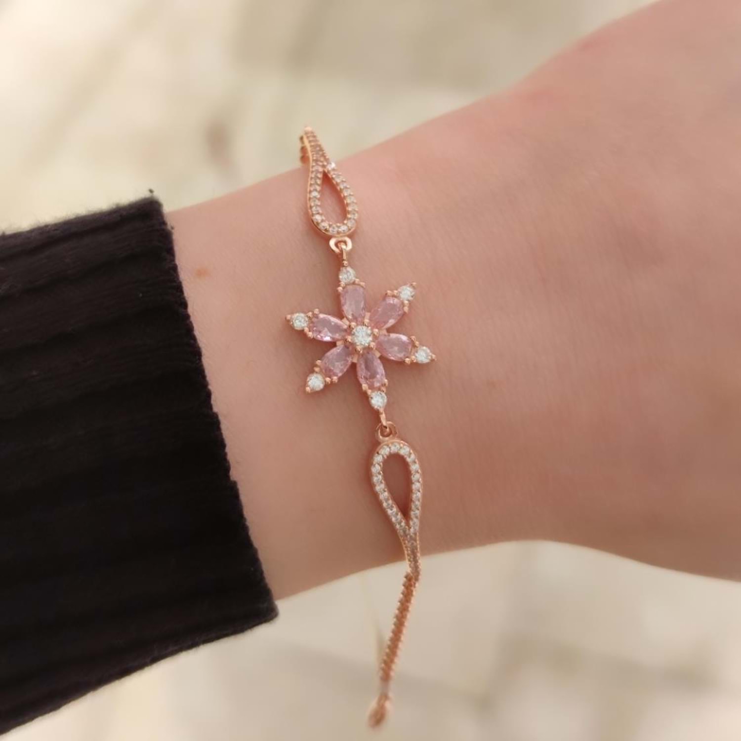 PEMBE TAŞLI LOTUS GÜMÜŞ BİLEKLİK - ROSE BAKIR