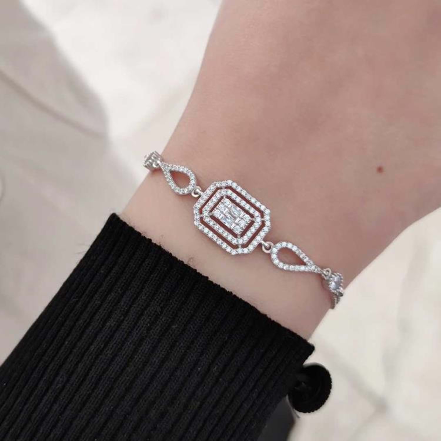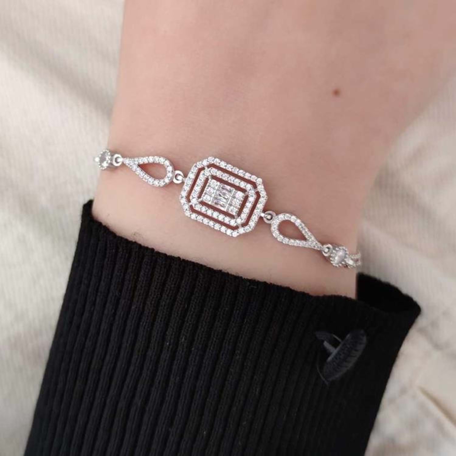925 AYAR GÜMÜŞ ORT GRAM : 4,22 gr ZİRKON TAŞLI PIRLANTA MONTÜR BAGET GÜMÜŞ BİLEKLİK BİLEKLİK UZUNLUĞU : 17 CM + 3 CM EK UZATMA HALKASI MEVCUTTUR KİMYASAL ÜRÜNLERLE TEMAS ETTİRMEYİNİZ