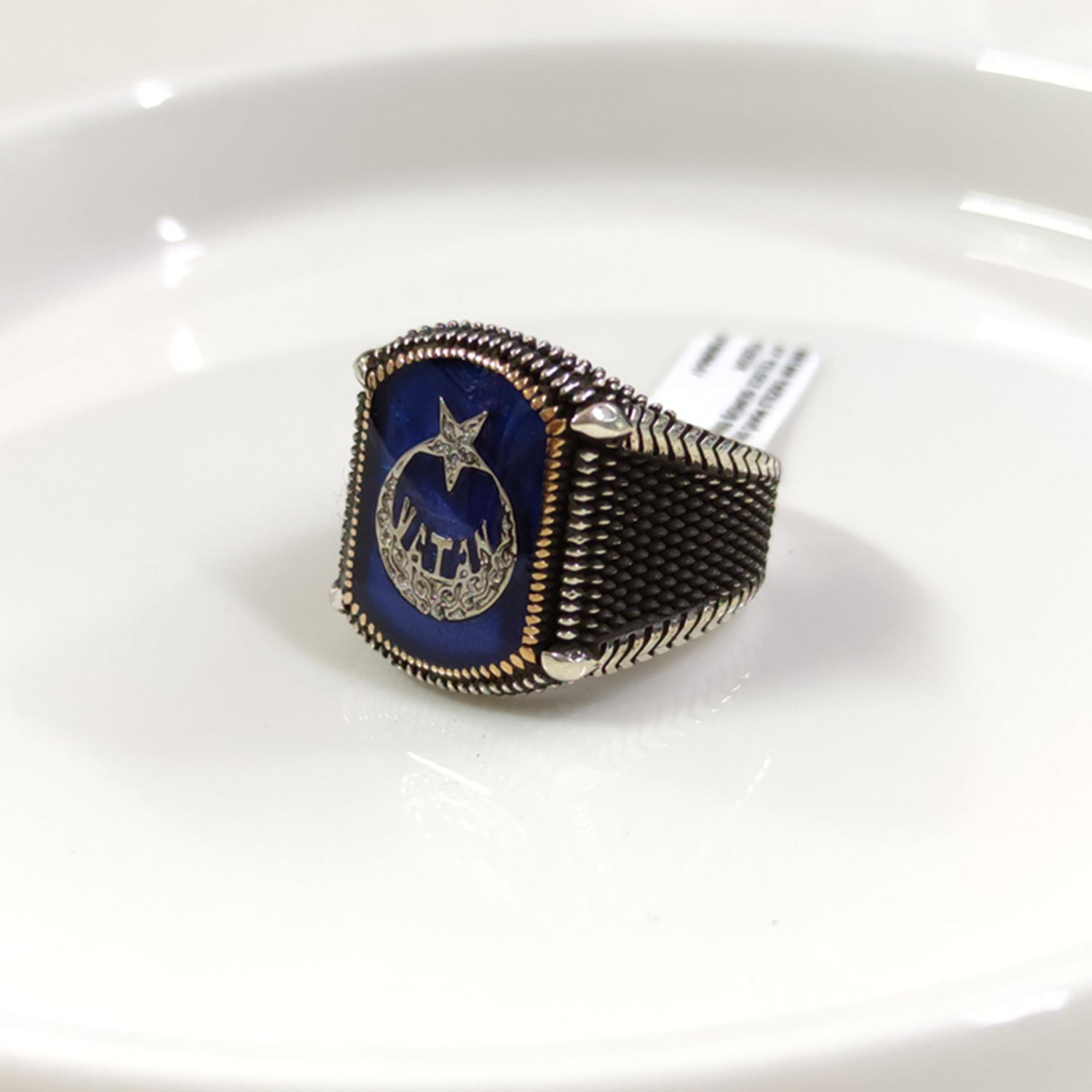 VATAN YAZILI MAVİ DETAY AY YILDIZ GÜMÜŞ ERKEK YÜZÜK