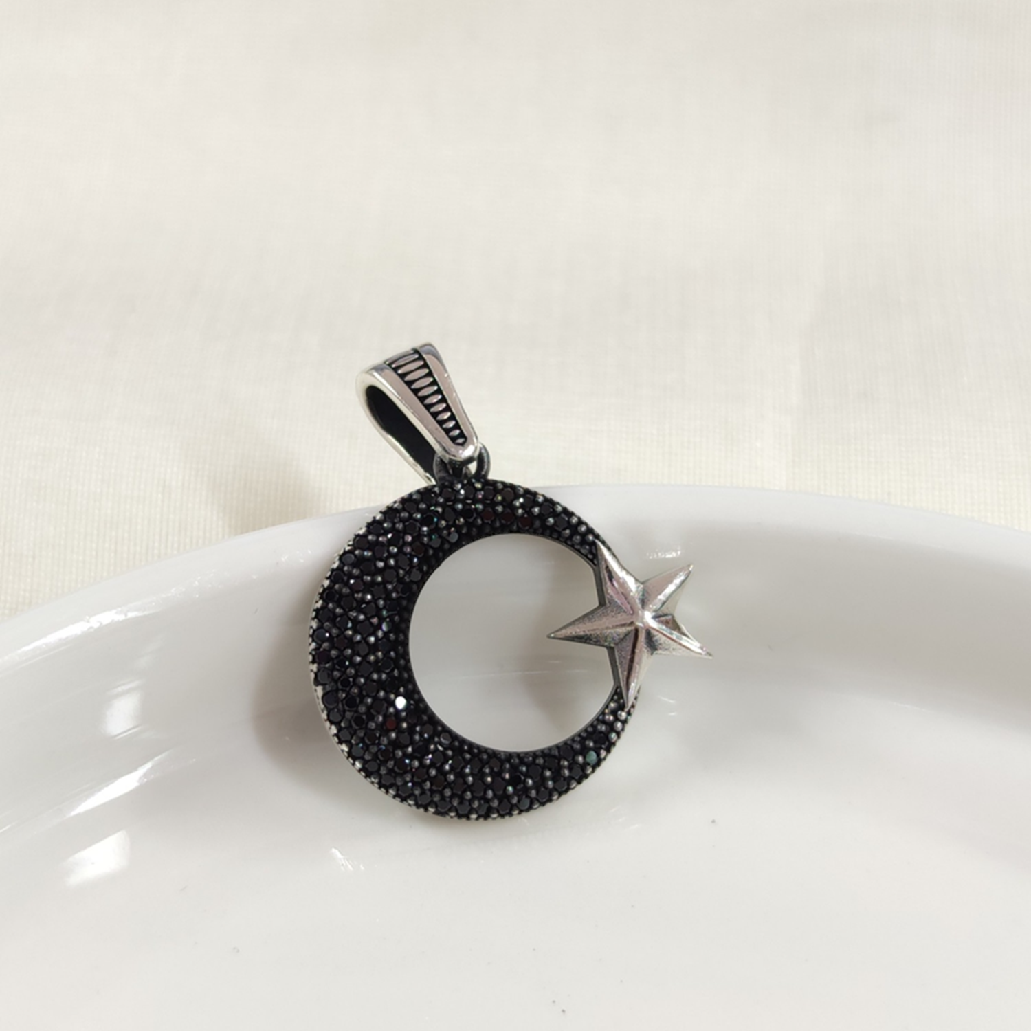 2,2 CM SİYAH TAŞLI AY YILDIZ GÜMÜŞ KOLYE UCU