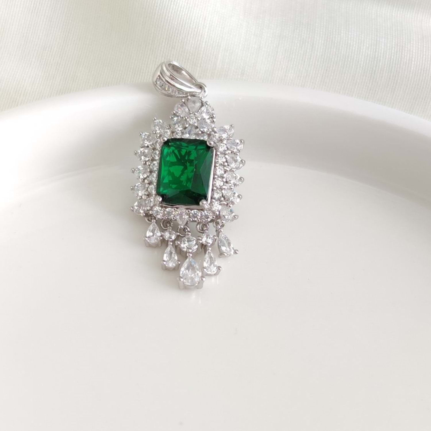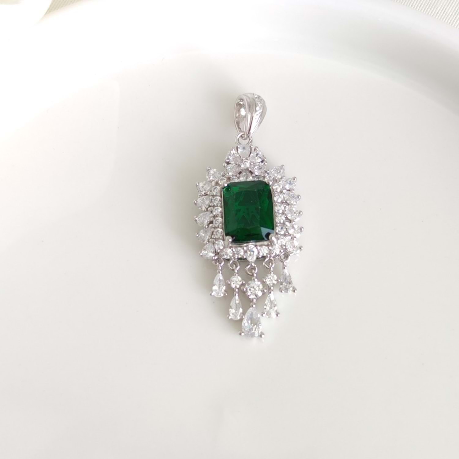 İTHAL İŞÇİLİKLİ YEŞİL TAŞLI BAGET SALLANTILI GÜMÜŞ KOLYE UCU 3 CM