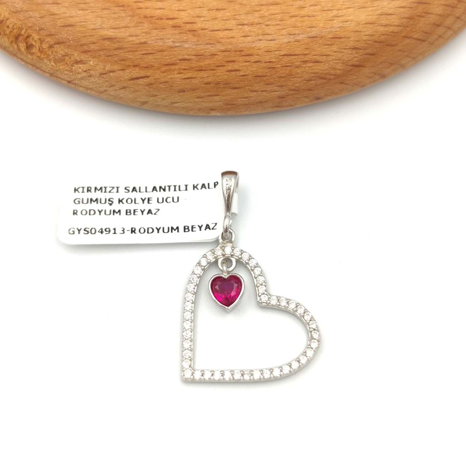 KIRMIZI SALLANTILI KALP GÜMÜŞ KOLYE UCU - RODYUM BEYAZ