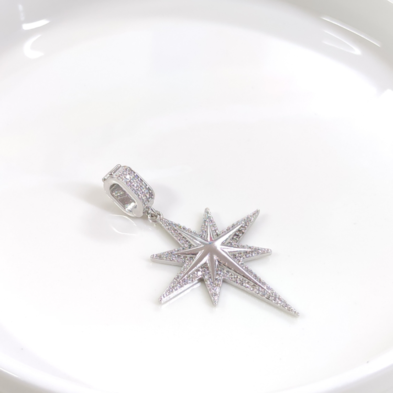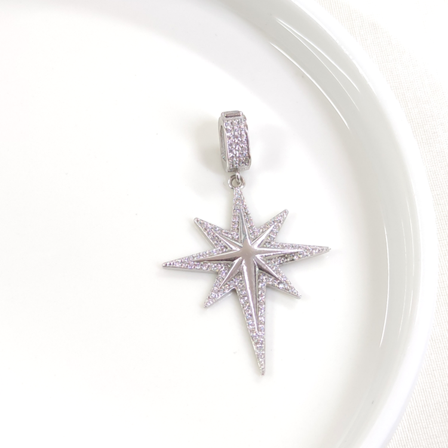 TAŞLI KUTUP YILDIZI GÜMÜŞ KOLYE UCU 4CM - RODYUM BEYAZ