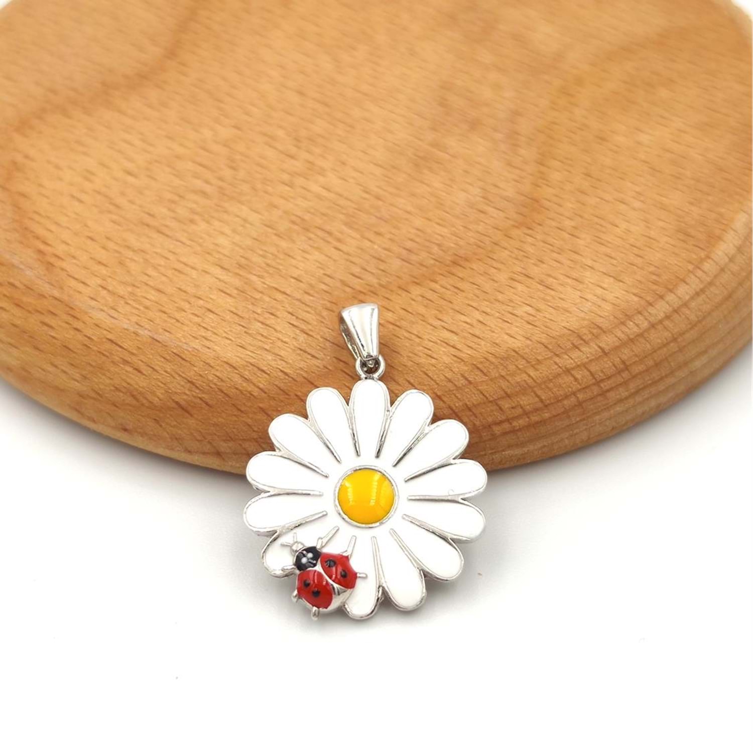 UĞUR BÖCEKLİ MİNELİ PAPATYA BÜYÜK GÜMÜŞ KOLYE UCU - RODYUM BEYAZ