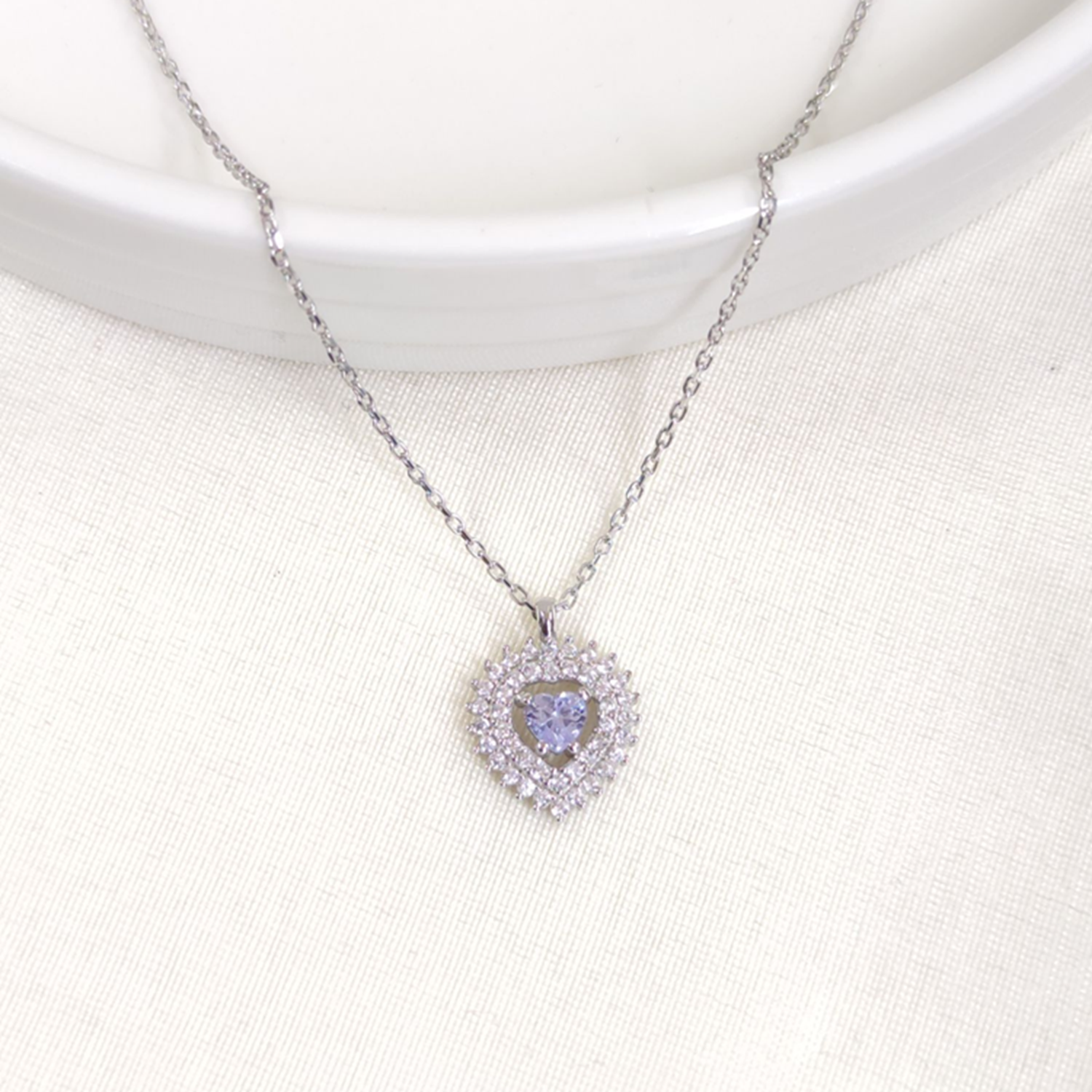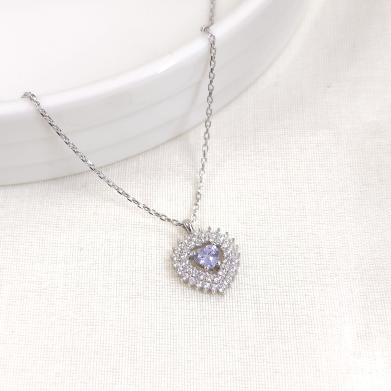 12 MM LİLA TAŞLI KALP GÜMÜŞ KOLYE 40+5 CM