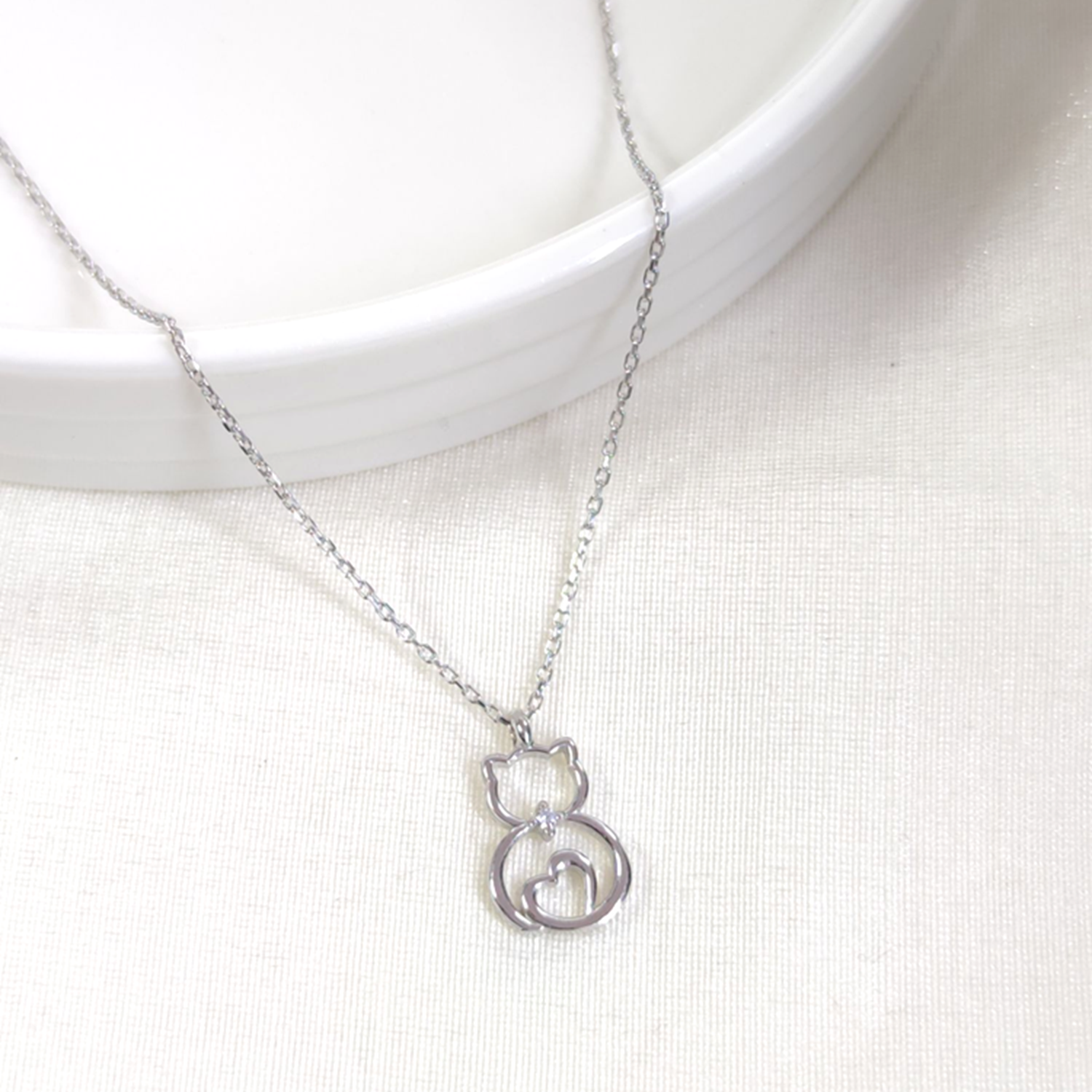 8X15 MM KALP DETAYLI KEDİ GÜMÜŞ KOLYE 40+5 CM - RODYUM BEYAZ