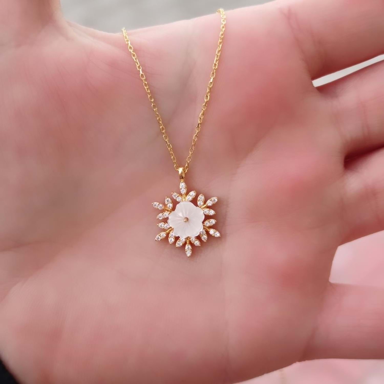 925 ayar gümüş, kolye ucu çapı : 1,70 cm manolya çiçeğinde sedef kullanılmıştır. zincir uzunluğu 40 cm+5 cm ek uzatma halkası mevcuttur kar tanesinde zirkon taş kullanılmıştır.