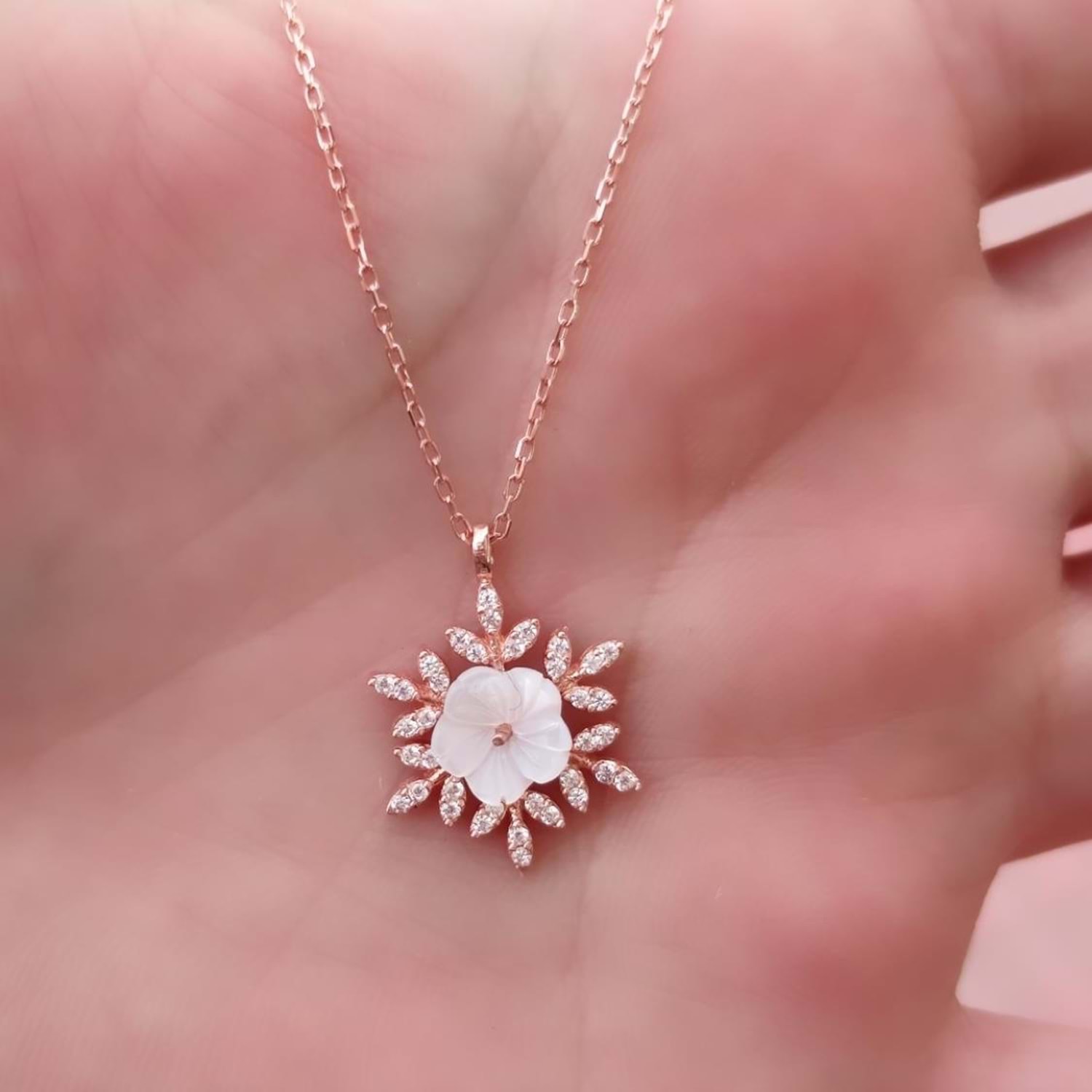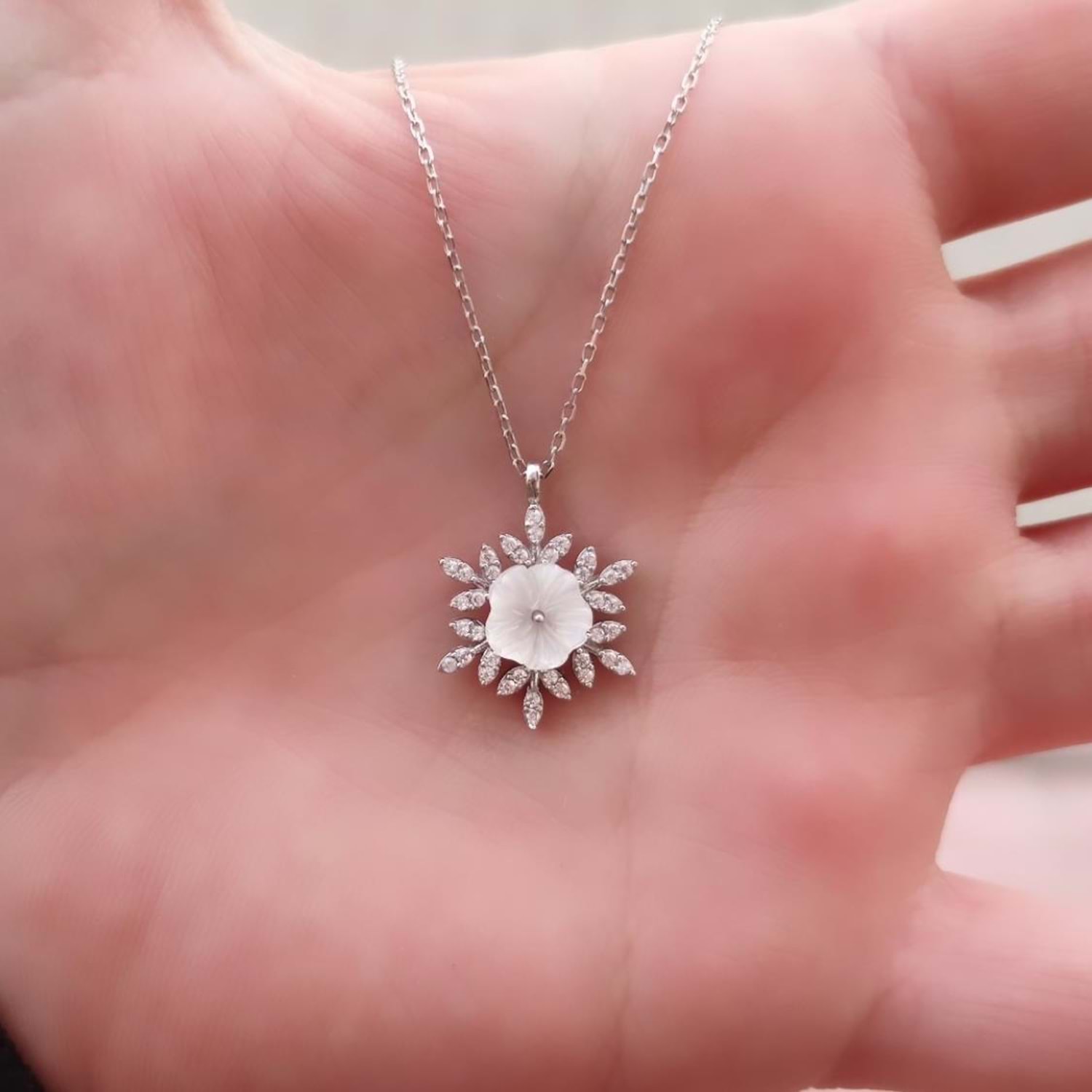 925 ayar gümüş, kolye ucu çapı : 1,70 cm manolya çiçeğinde sedef kullanılmıştır. zincir uzunluğu 40 cm+5 cm ek uzatma halkası mevcuttur kar tanesinde zirkon taş kullanılmıştır.