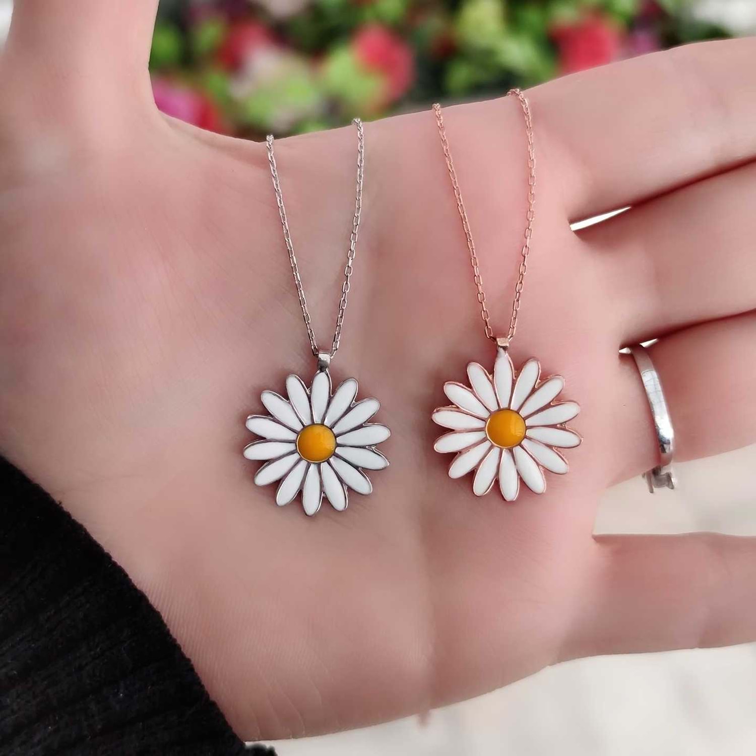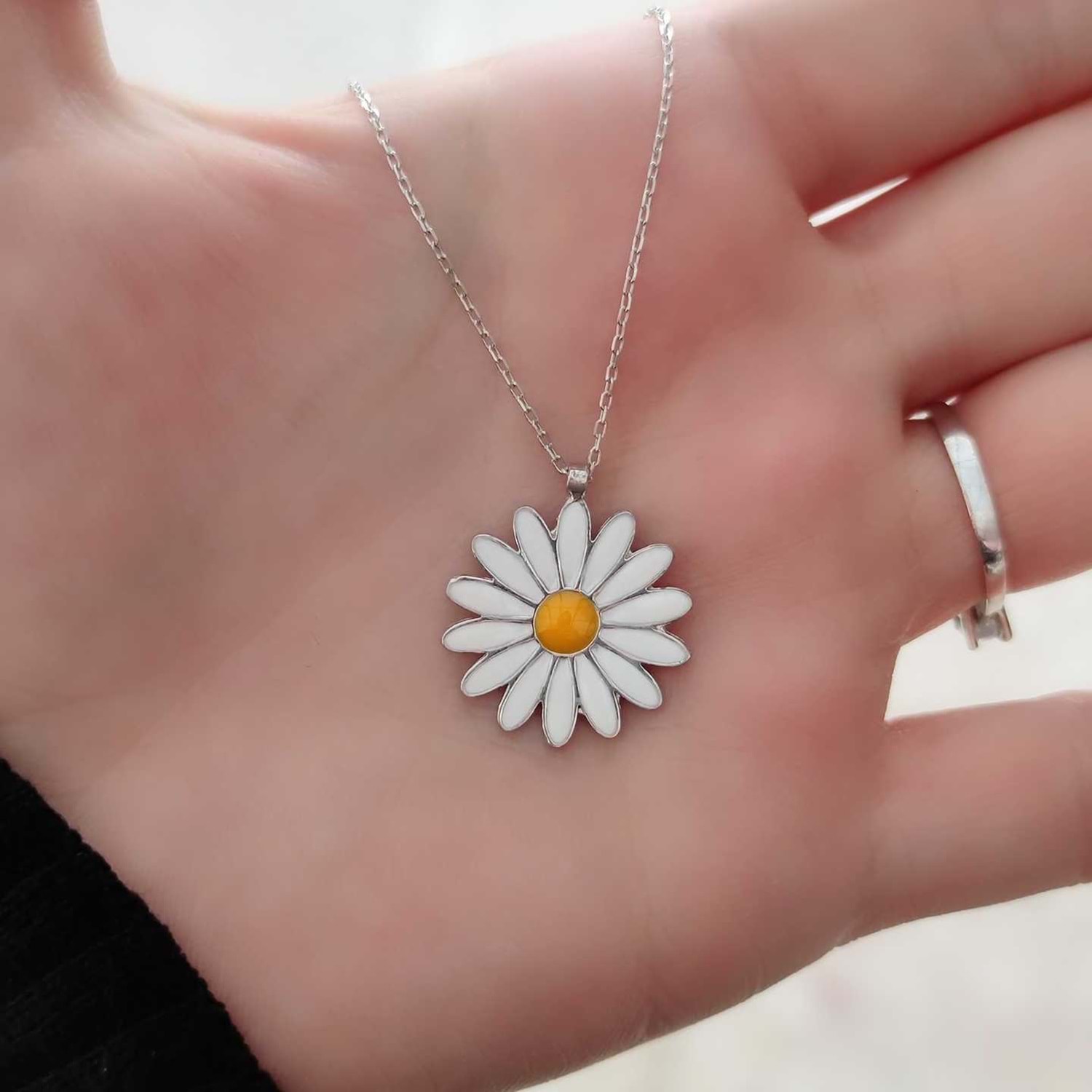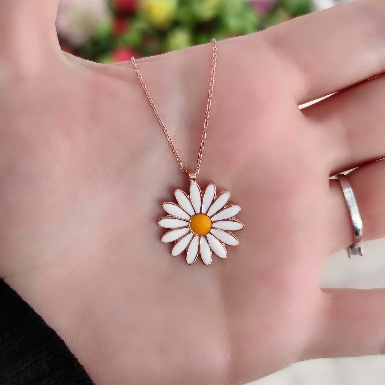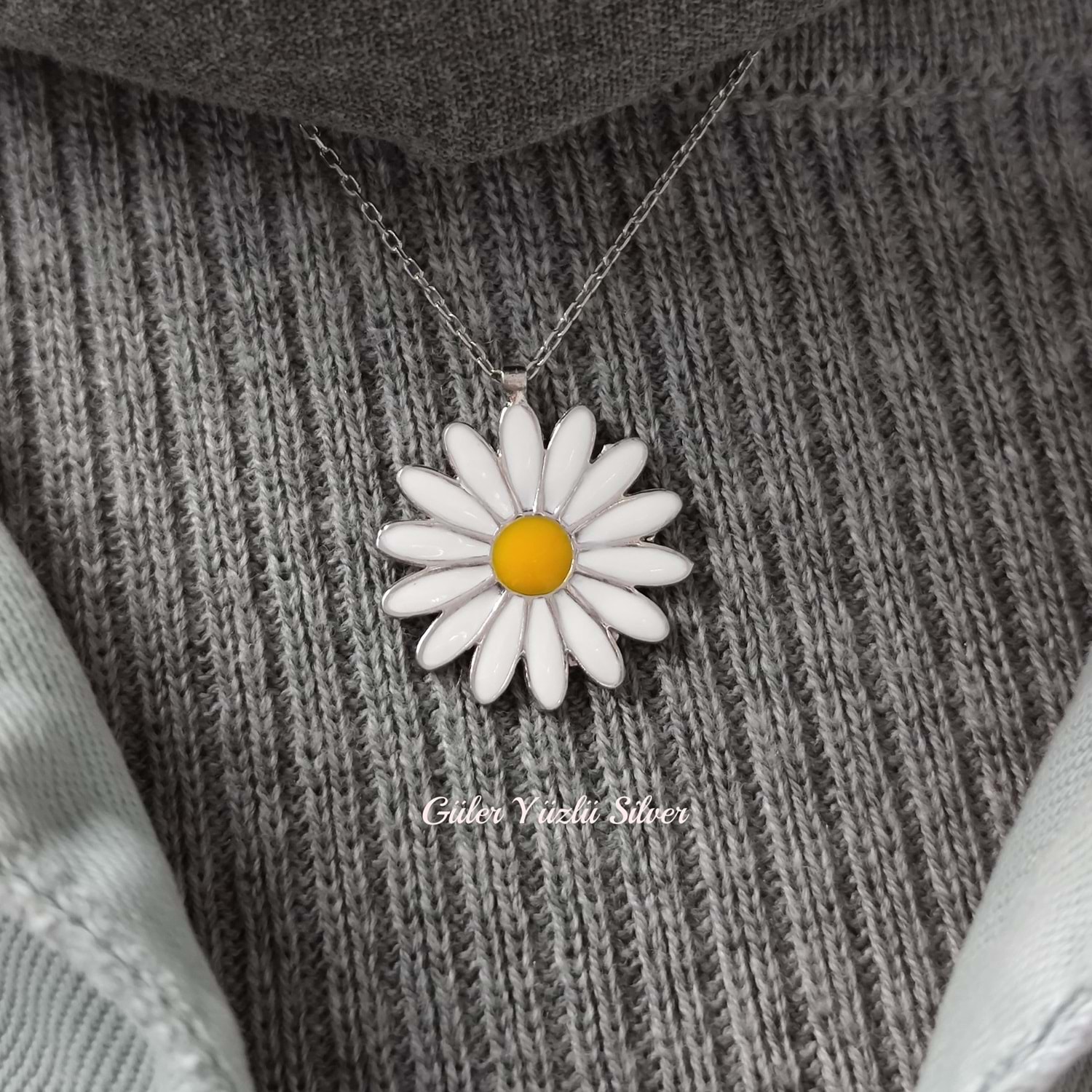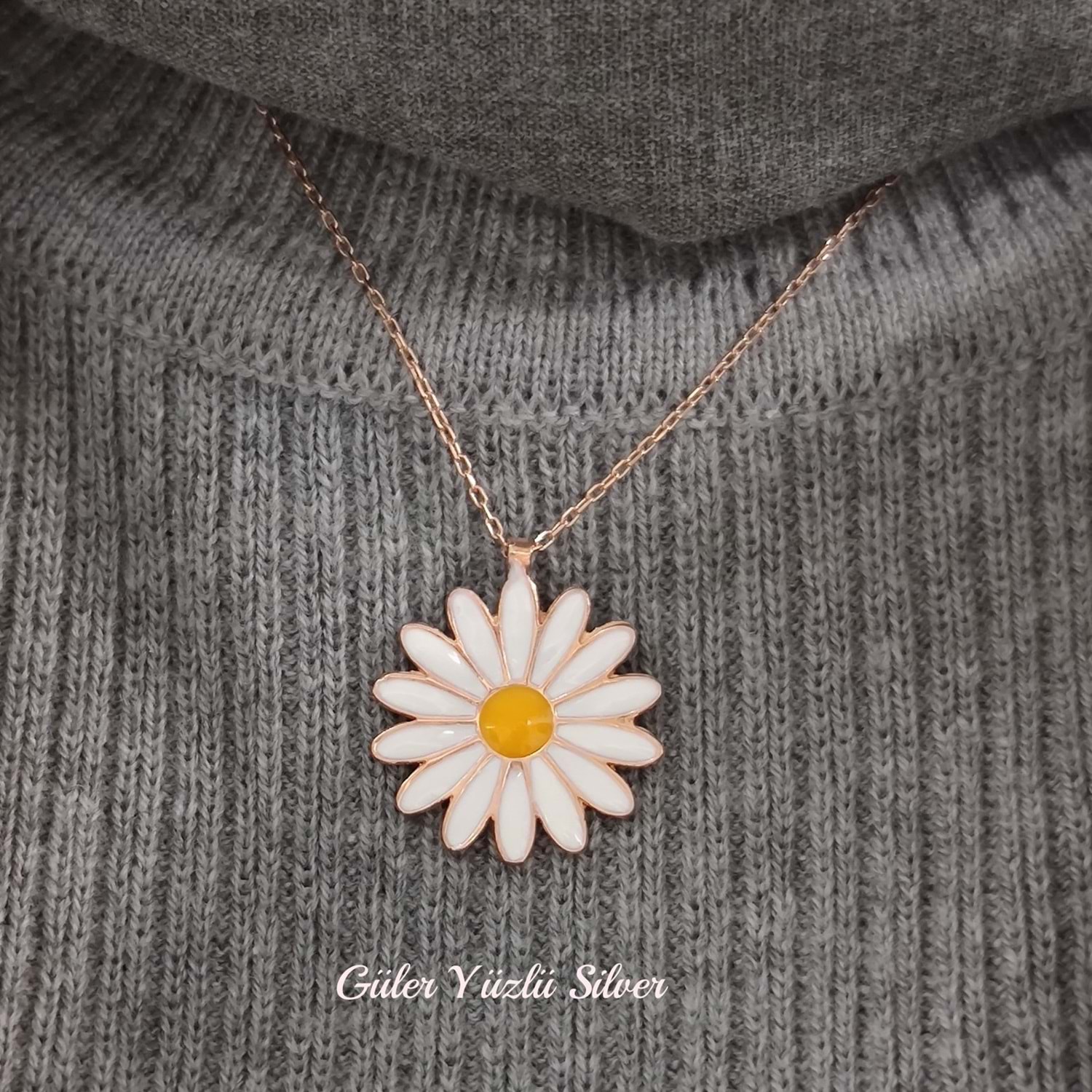 925 ayar gümüştür. Papatya 2 cm dir Seçeneklerden istediğiniz rengi seçip sipariş verebilirsiniz. Papatya çiçeği, saf ve temiz sevgi anlamını taşımaktadır. Temiz kalbi simgeler. İnsana samimiyet hissi verir. Kendine has sade ve gösterişten uzak duruşu ile kadınların hayır diyemeyeceği kolyelerden birisidir. Papatya çiçeğinin hikâyesi, papatyaya daha farklı bakmanızı sağlayacak türden bir hikâyeye sahip. Papatya, her türden çiçeğin bir arada bulunduğu, büyük bir bahçede yaşıyormuş. Bahçenin yaşlı bahçıvanına âşık olmuş. Yüzlerce çiçeğin arasından sadece kendisi ile ilgilensin, suyunu döksün istiyormuş. O kadar çiçeğin arasından kendisini bir gün görür umudu ile bekliyormuş. Bahçıvanın diğer çiçeklerle ilgilenmesini kıskanıyormuş. Zaman geçtikçe aşkın ağırlığını taşıyamaz olmuş. Boynunu bükmüş. Bahçıvanı göremese de sadece sesini duyuyormuş. Papatyaya, bahçıvanın sesini duyması bile yetiyormuş. Bir gün bahçıvan papatyaya doğru yaklaşmış.