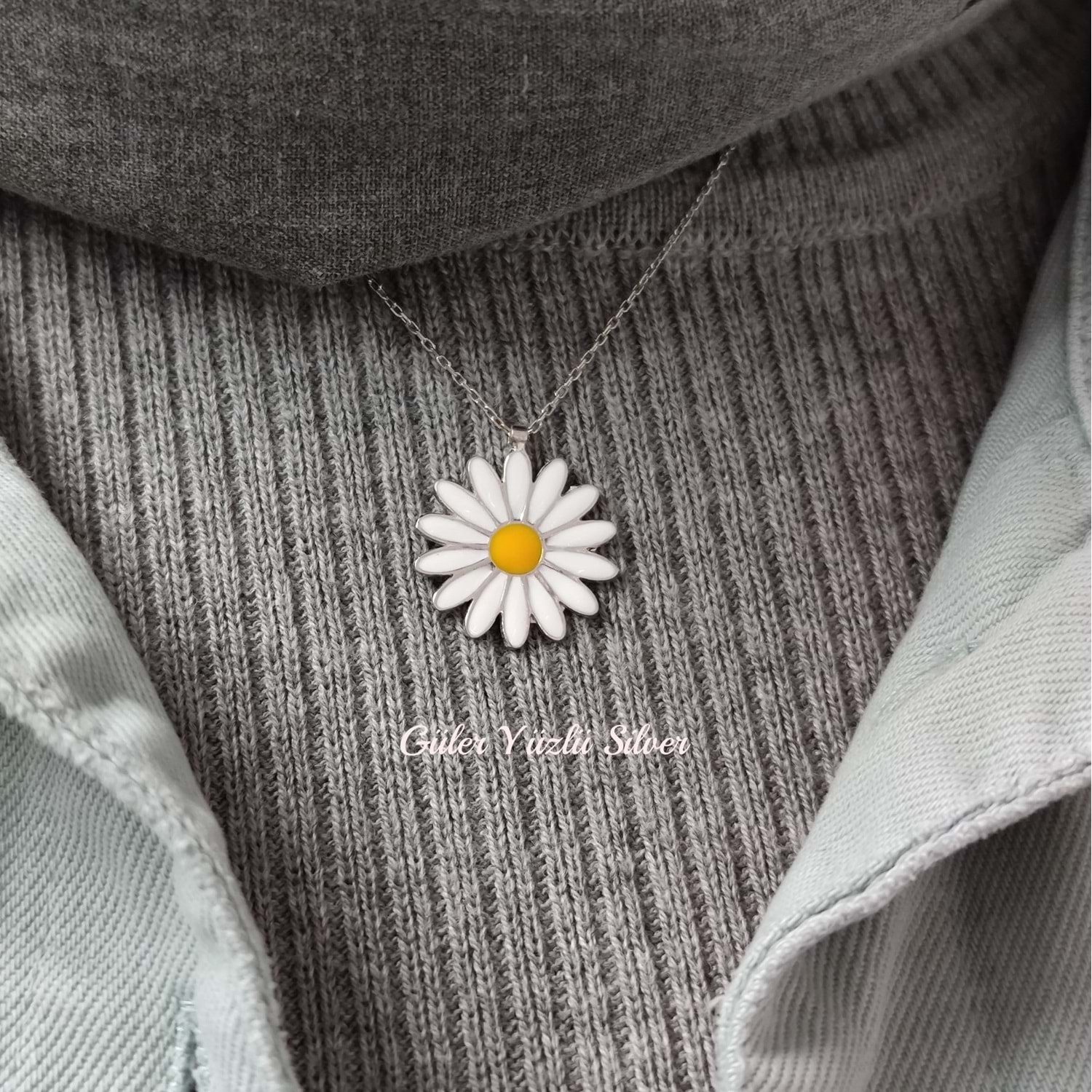 MİNELİ PAPATYA GÜMÜŞ KOLYE - RODYUM KAPLAMA