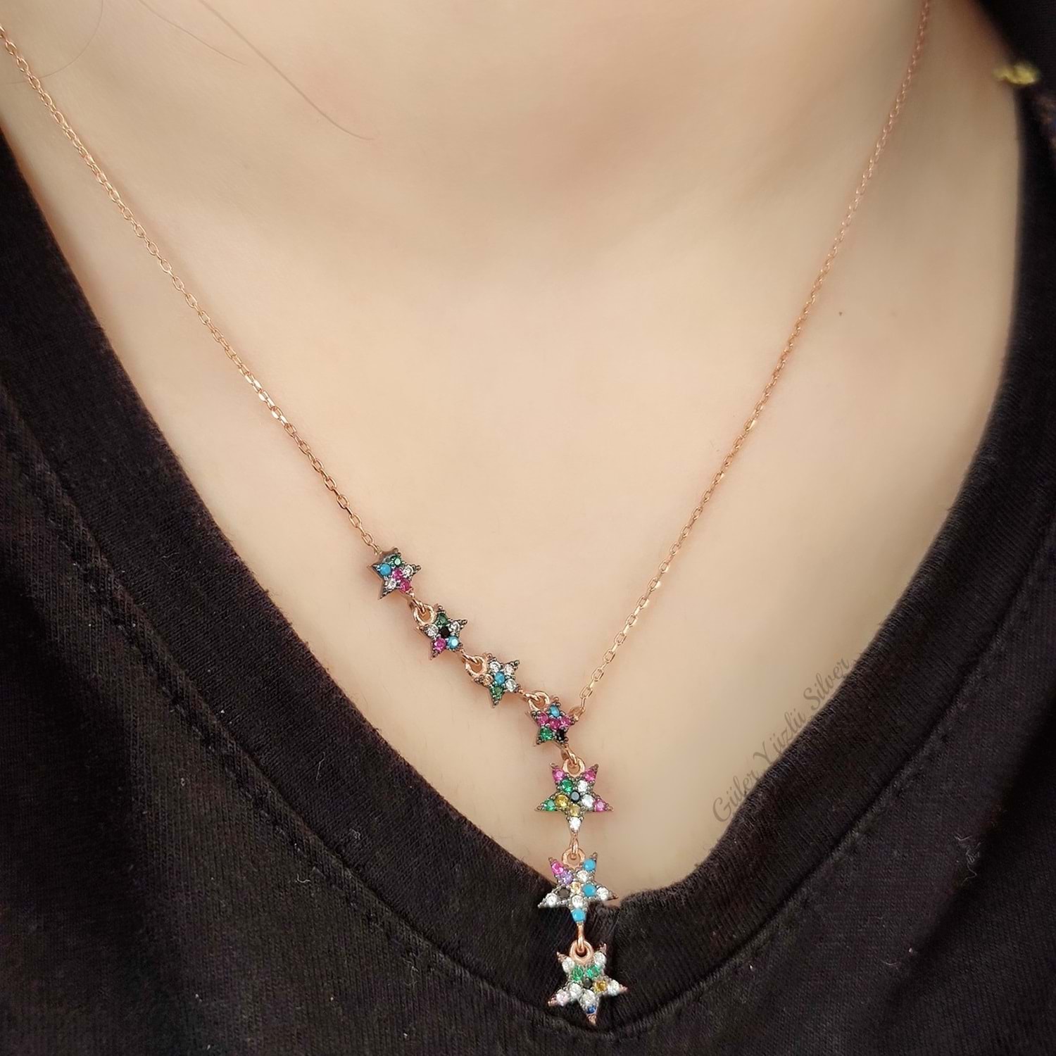 MİX TAŞLI SIRALI YILDIZ GÜMÜŞ KOLYE