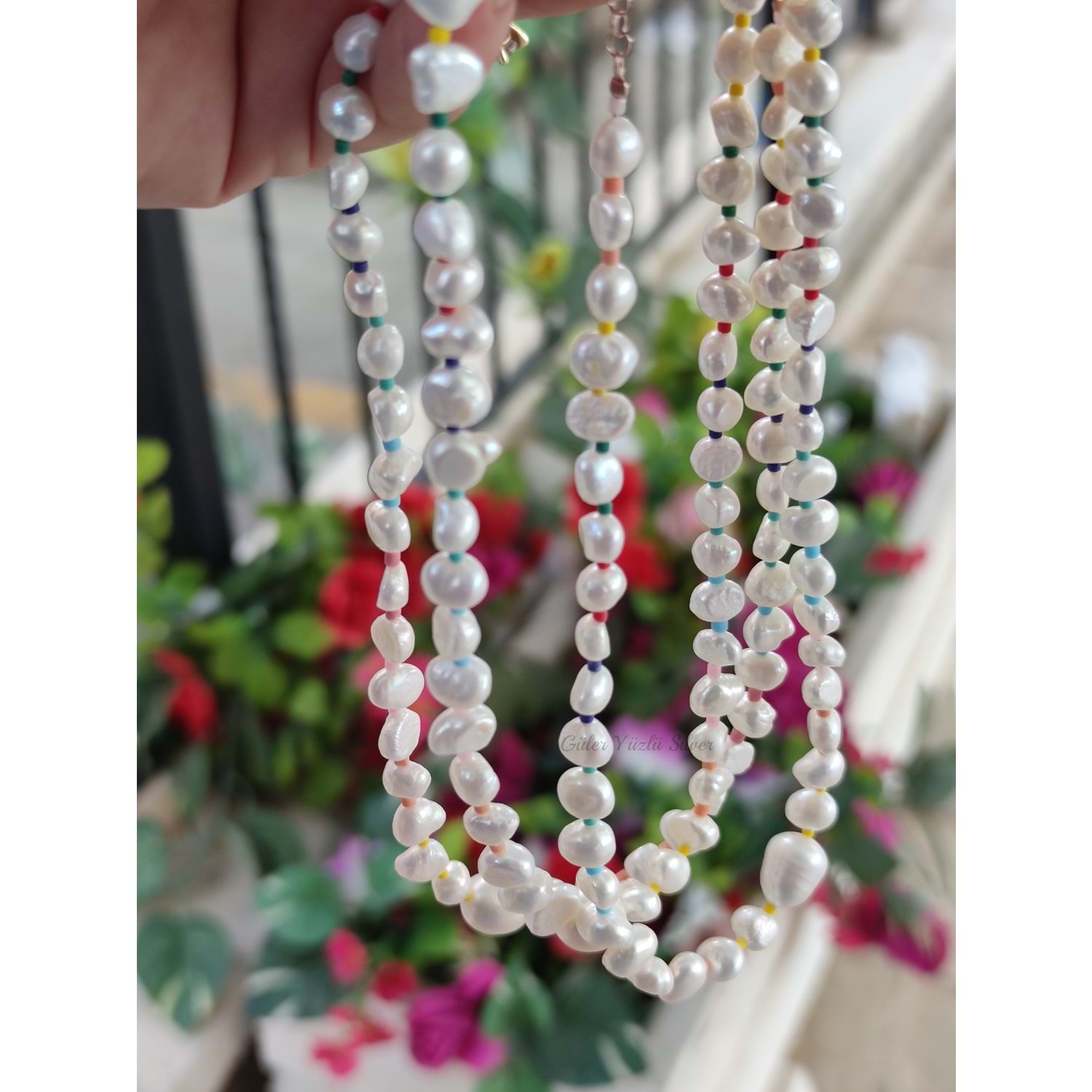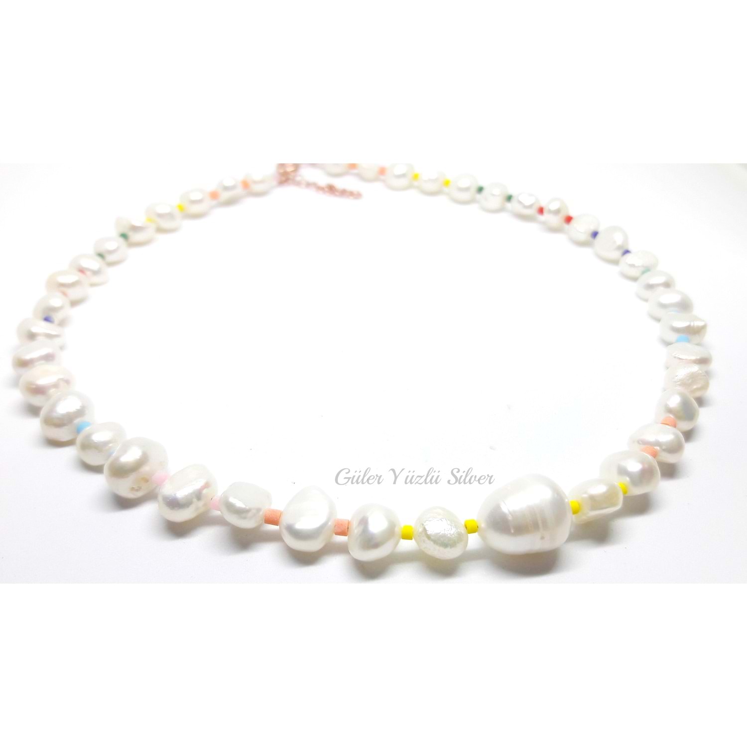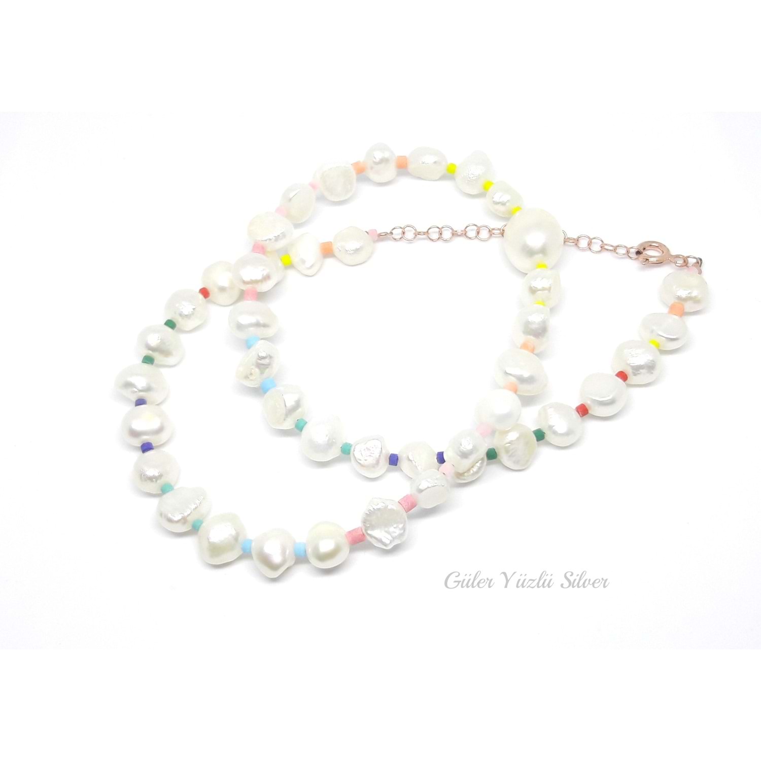 RENKLİ BONCUK DETAYLI BAROK İNCİ GÜMÜŞ KOLYE