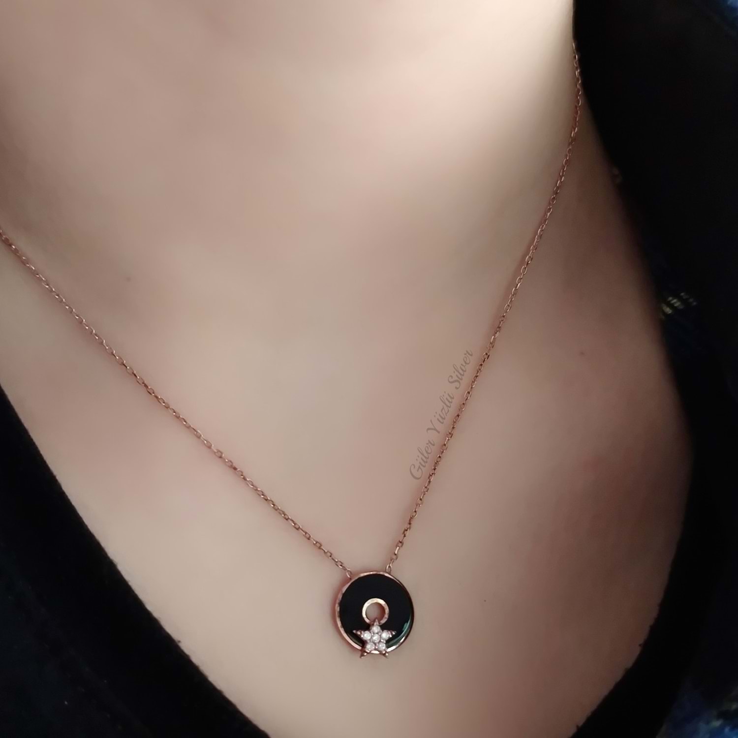 925 ayar gümüş siyah mineli taşlı yıldızlı mini rose kolye