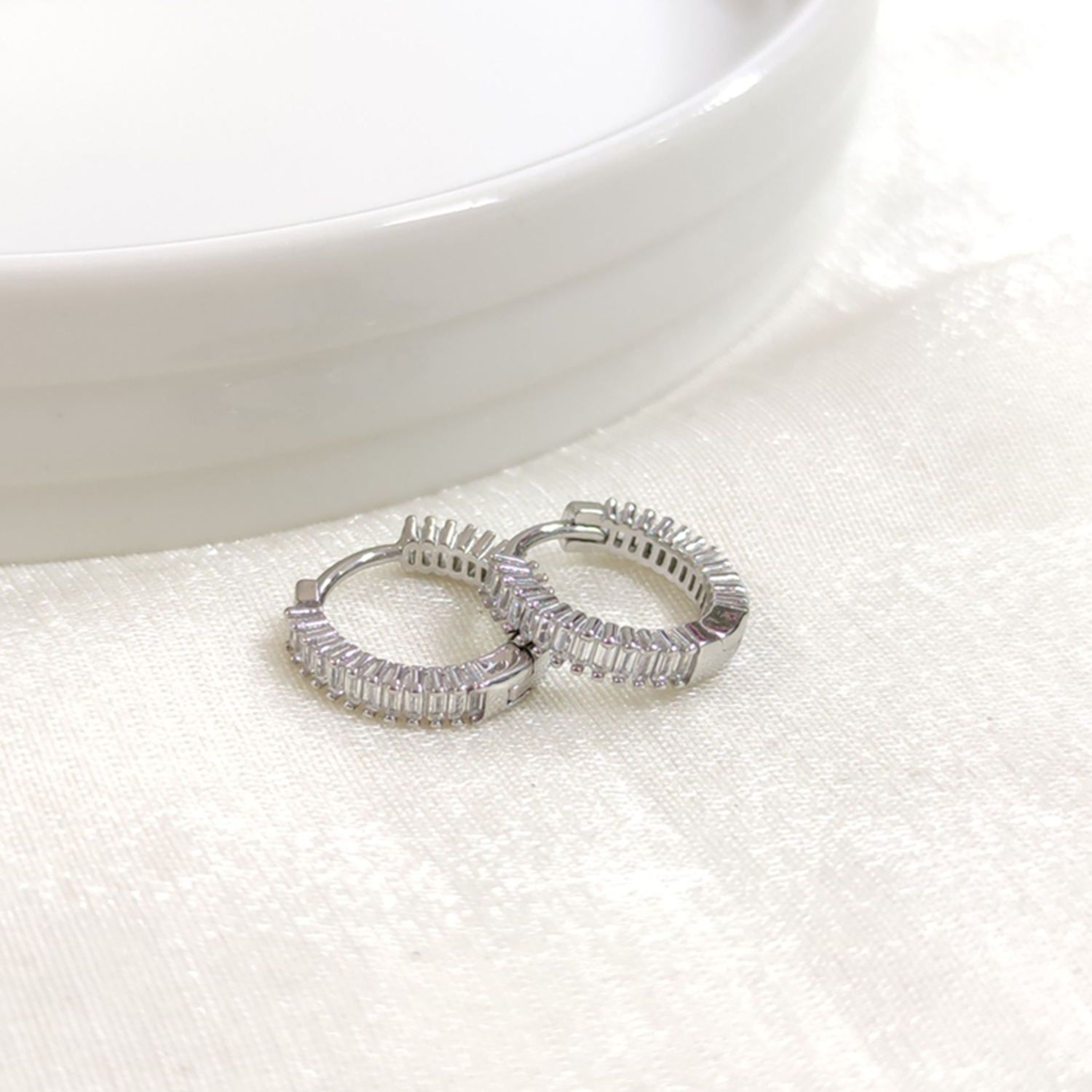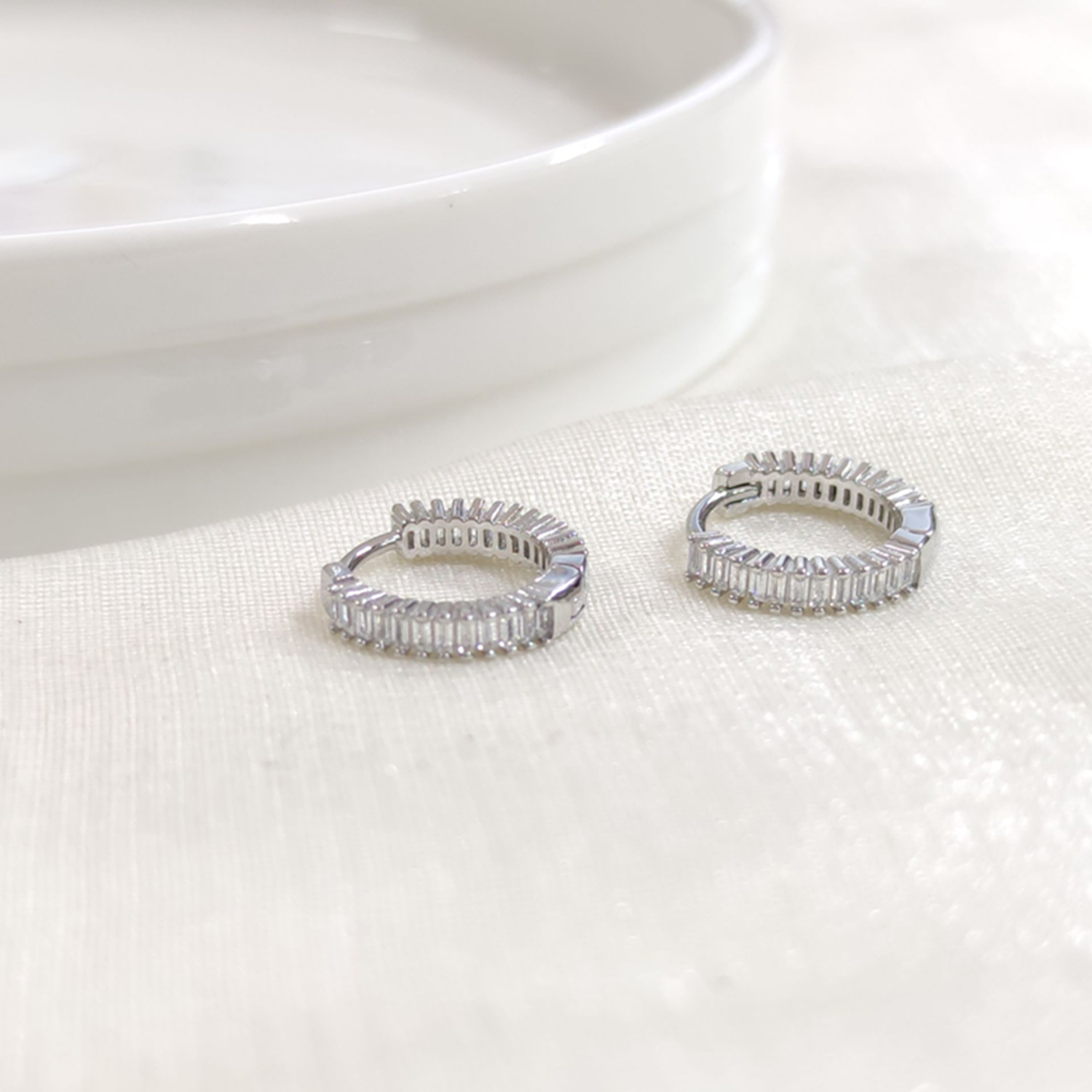 İTHAL 11 MM BAGET TAŞLI GÜMÜŞ HALKA KÜPE - RODYUM BEYAZ