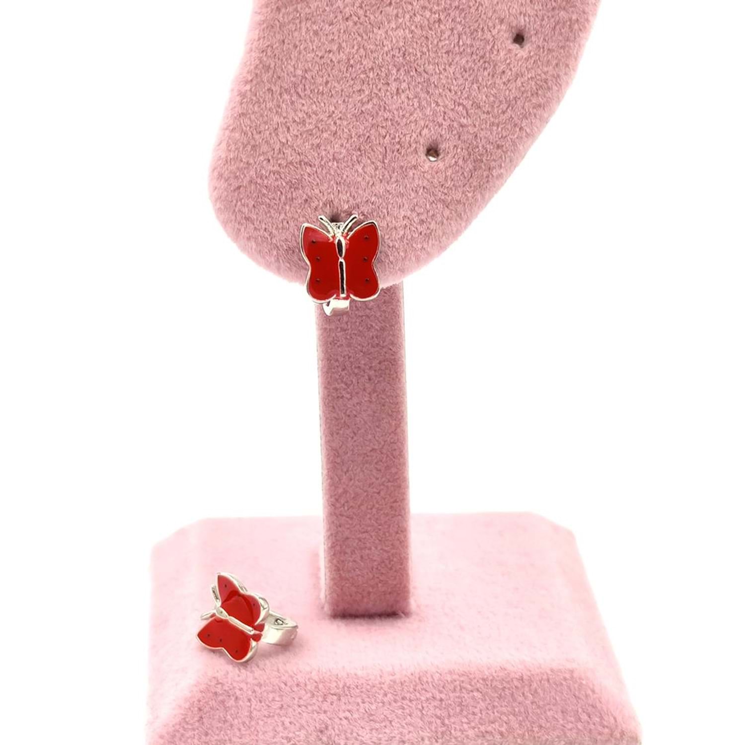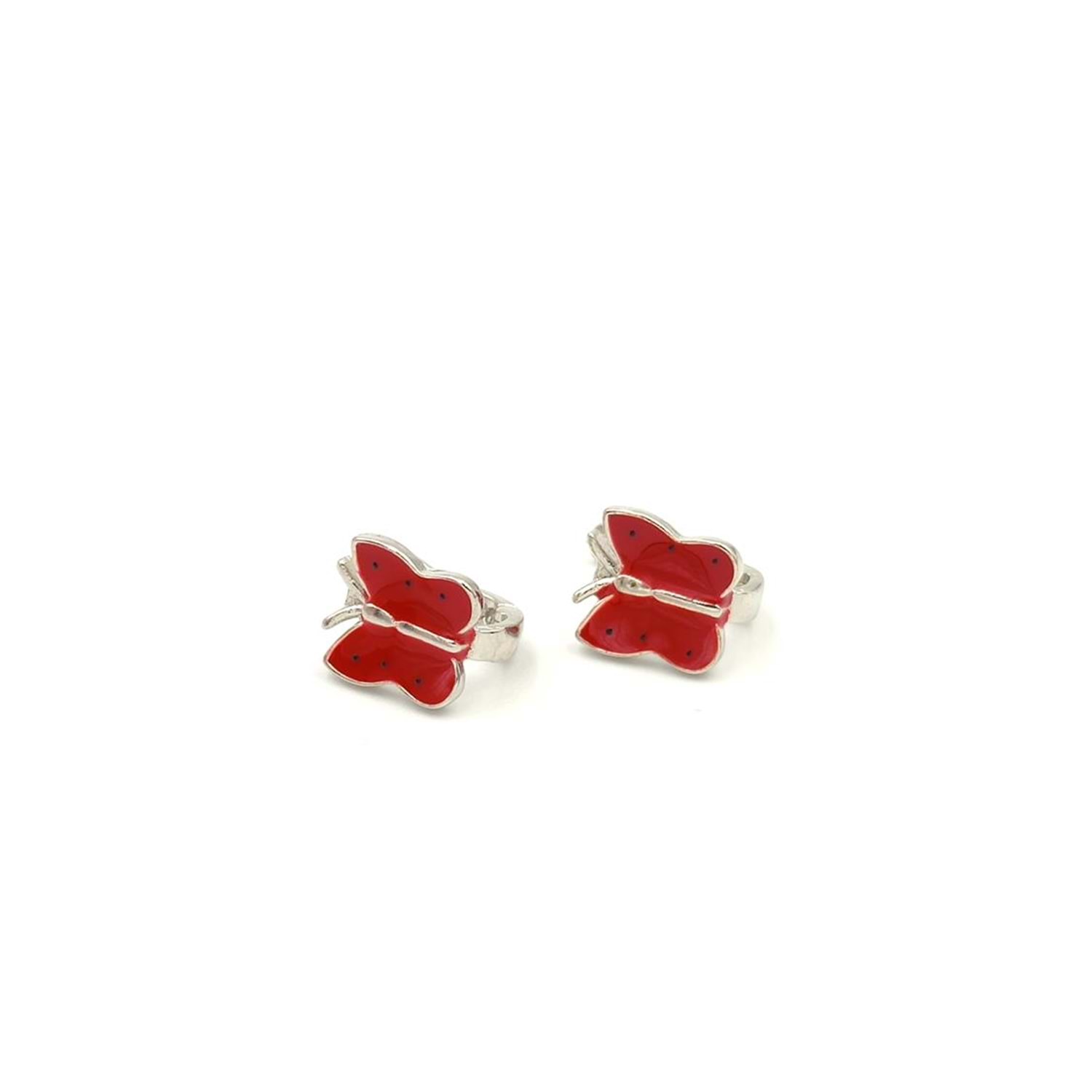 KIRMIZI MİNELİ KELEBEK ÇOCUK GÜMÜŞ KÜPE - RODYUM BEYAZ