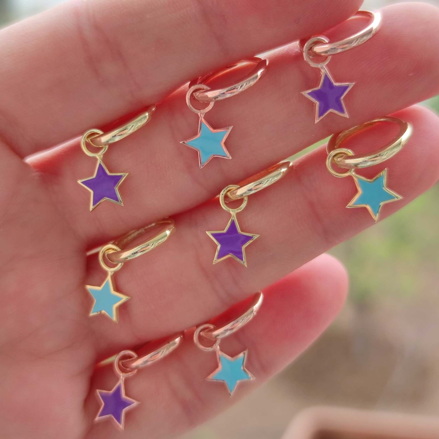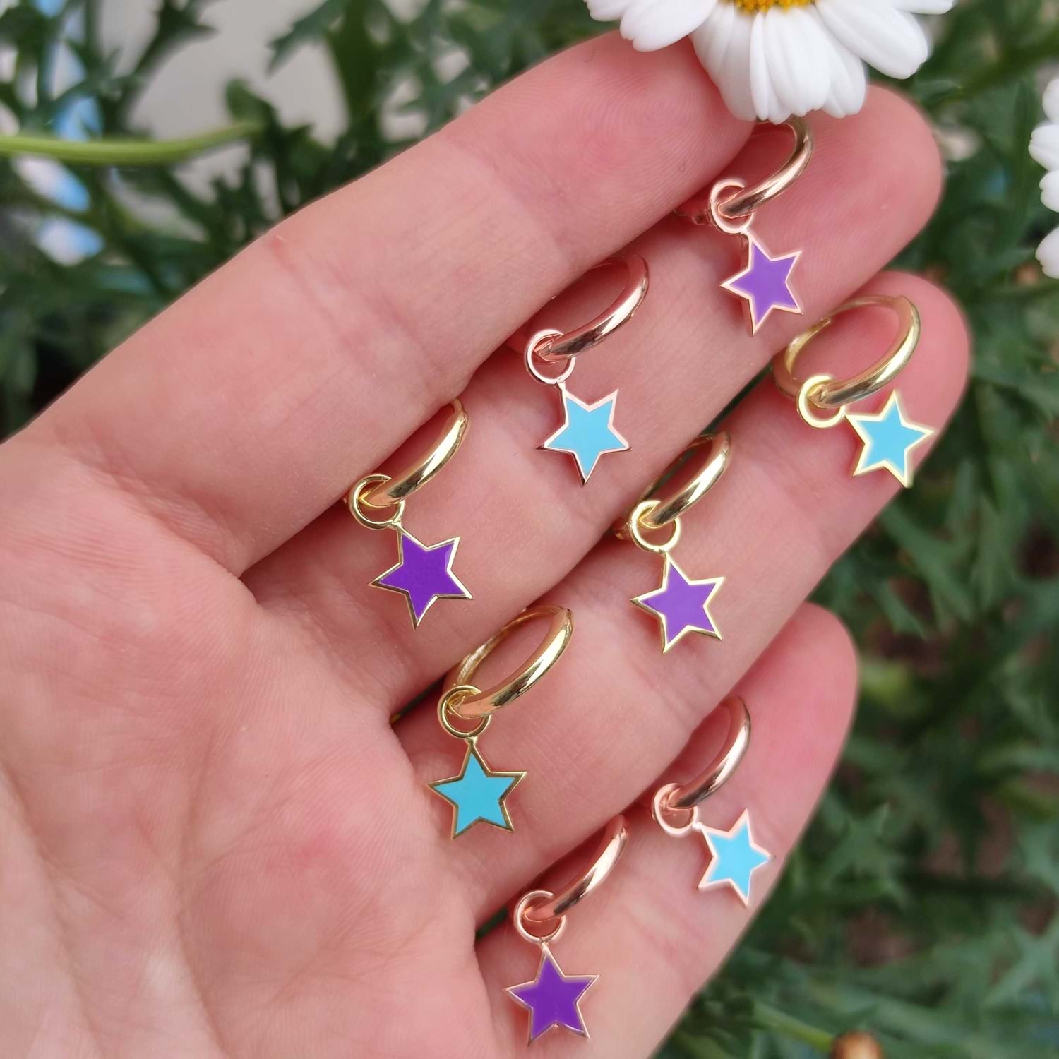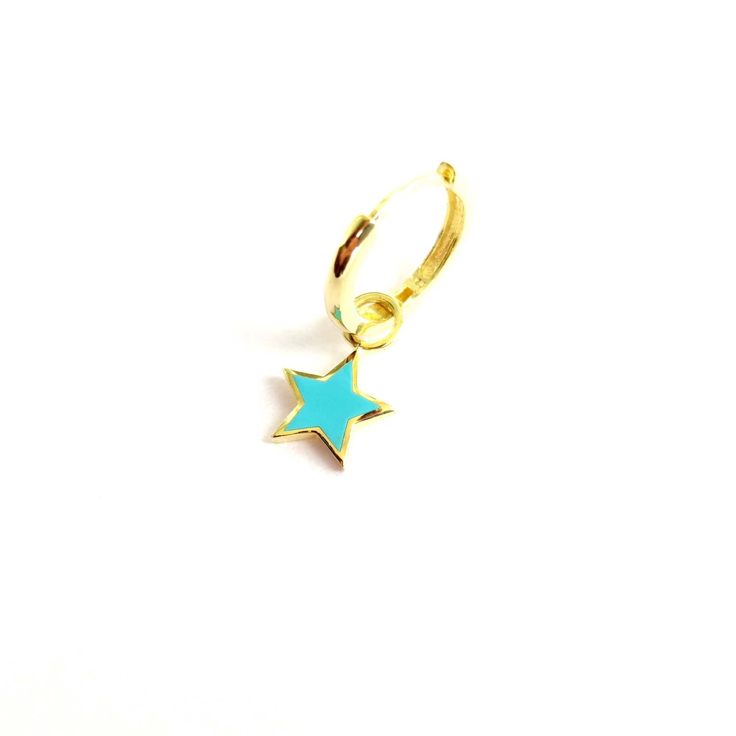 MAVİ MİNELİ YILDIZ TEK GÜMÜŞ HALKA KÜPE - ALTIN SARI