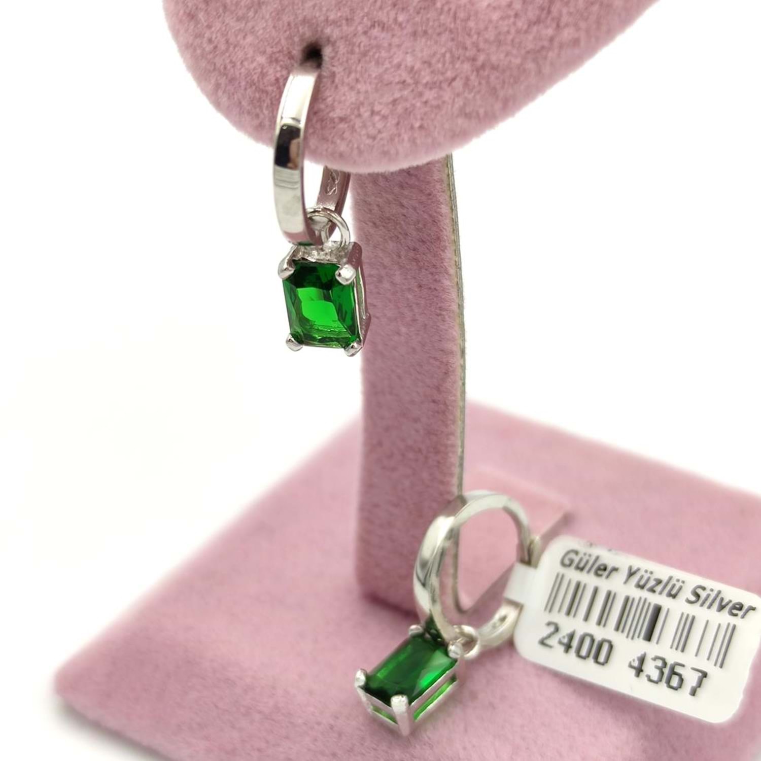 925 AYAR GÜMÜŞ ORT AĞIRLIK : 2,86 gr HALKA ÇAPI: 1,1 CM BAGET BOYUTU : 6 MM* 7 MM YEŞİL TAŞLI KÜPE