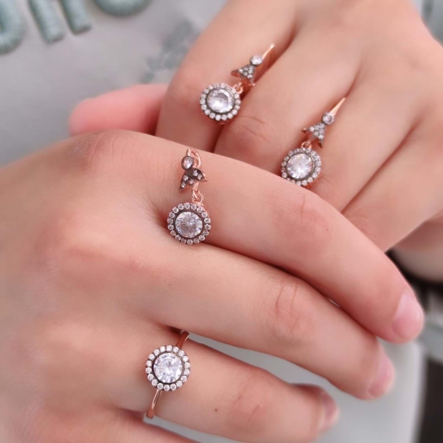 925 AYAR GÜMÜŞ KÜPE, KOLYE UCU VE YÜZÜKTEN OLUŞMAKTADIR. ROSE ALTIN KAPLAMADIR. ORTALAMA AĞIRLIK : 6,76 GR TAŞ BOYUT : 1 CM ZİNCİR DAHİL DEĞİLDİR.
