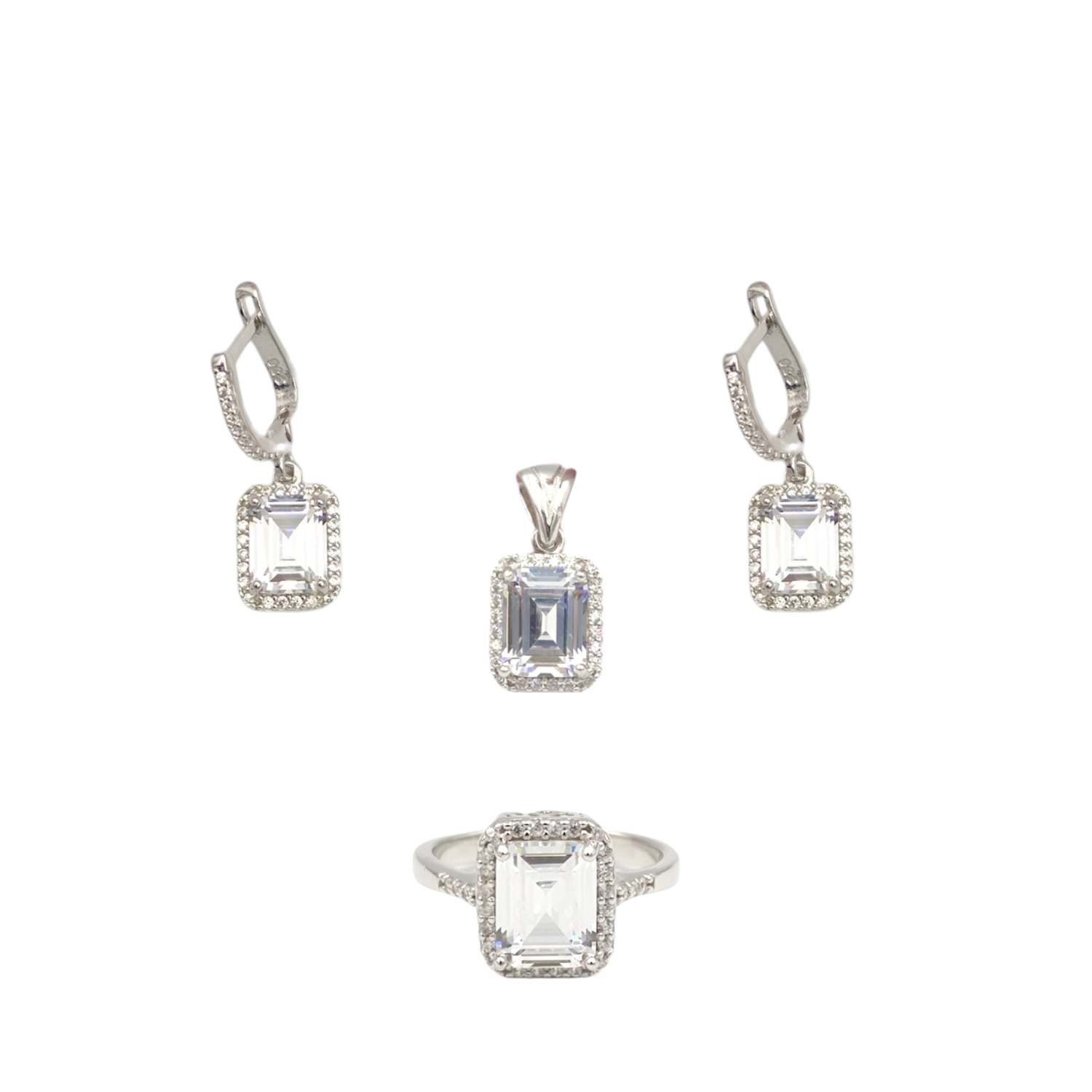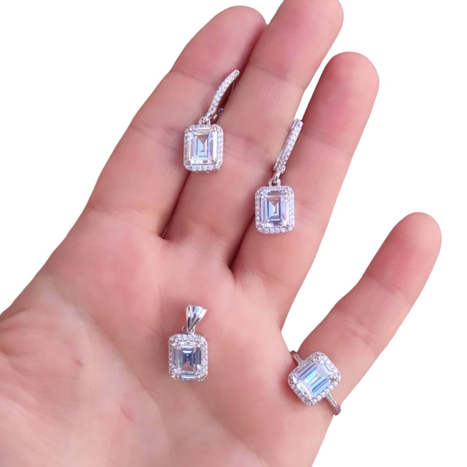 925 AYAR GÜMÜŞ ÖZEL KESİM TAŞ KULLANILMIŞTIR. ÜÇ PARÇADAN OLUŞMAKTADIR. KÜPE, KOLYE UCU VE YÜZÜK TAŞ BOYUTU : 1,2 CM ORT GRAM : 11,73 gr