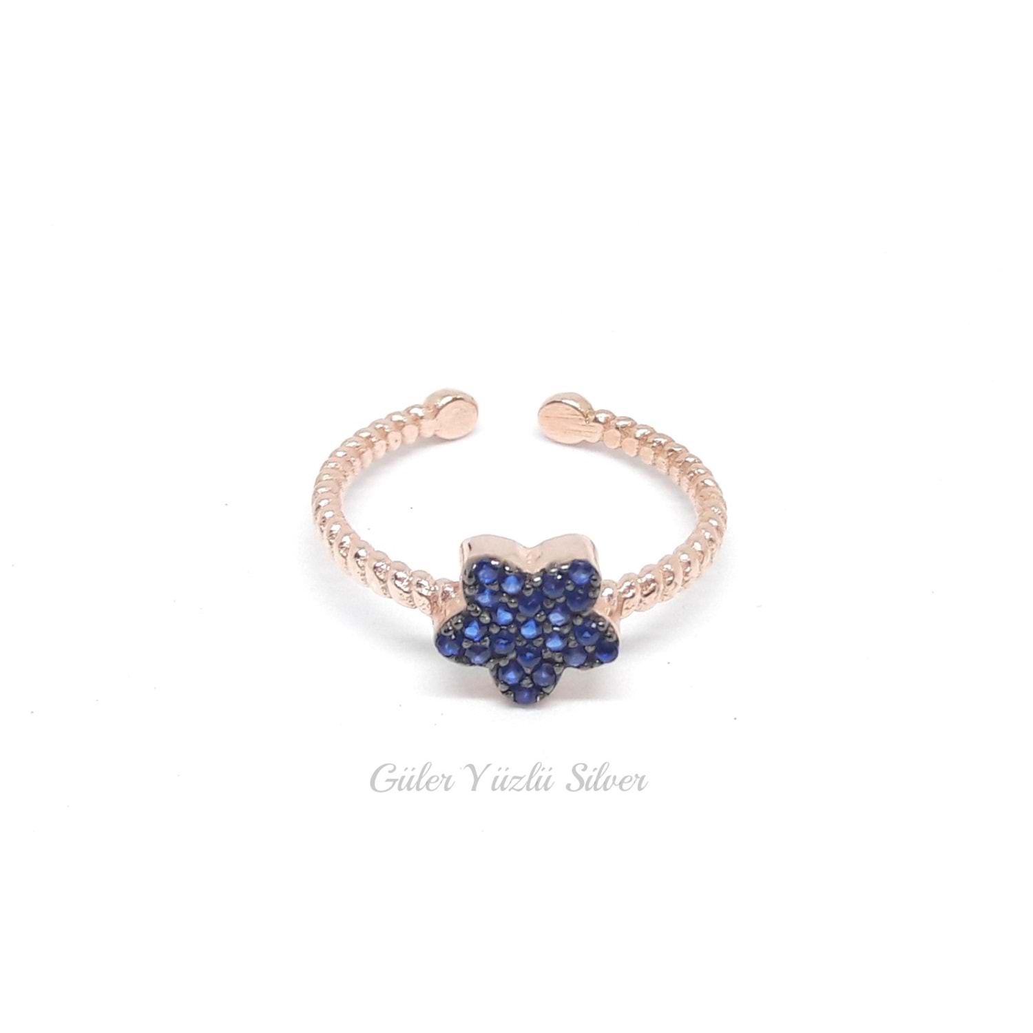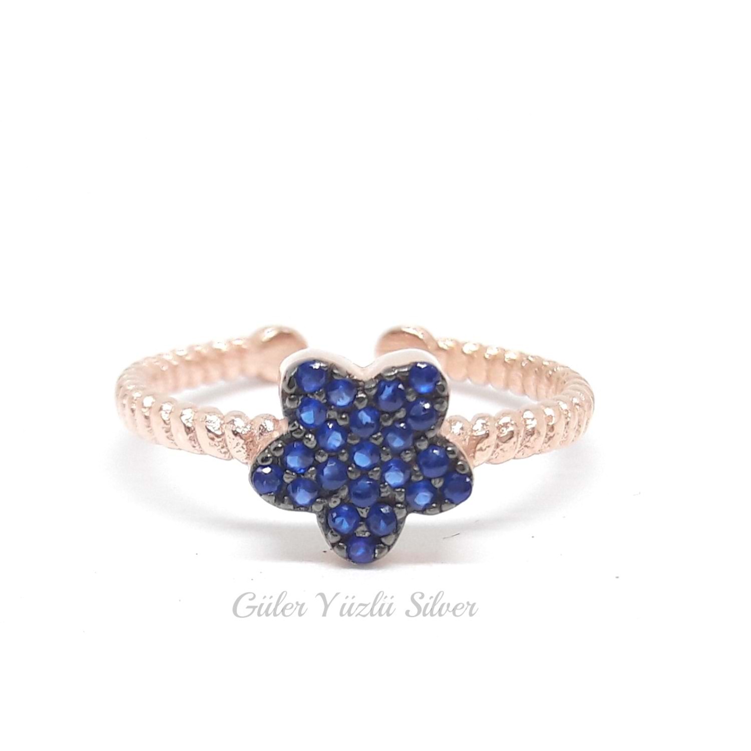 AYARLANABİLİR MAVİ TAŞLI ÇİÇEK ÇITIR GÜMÜŞ YÜZÜK