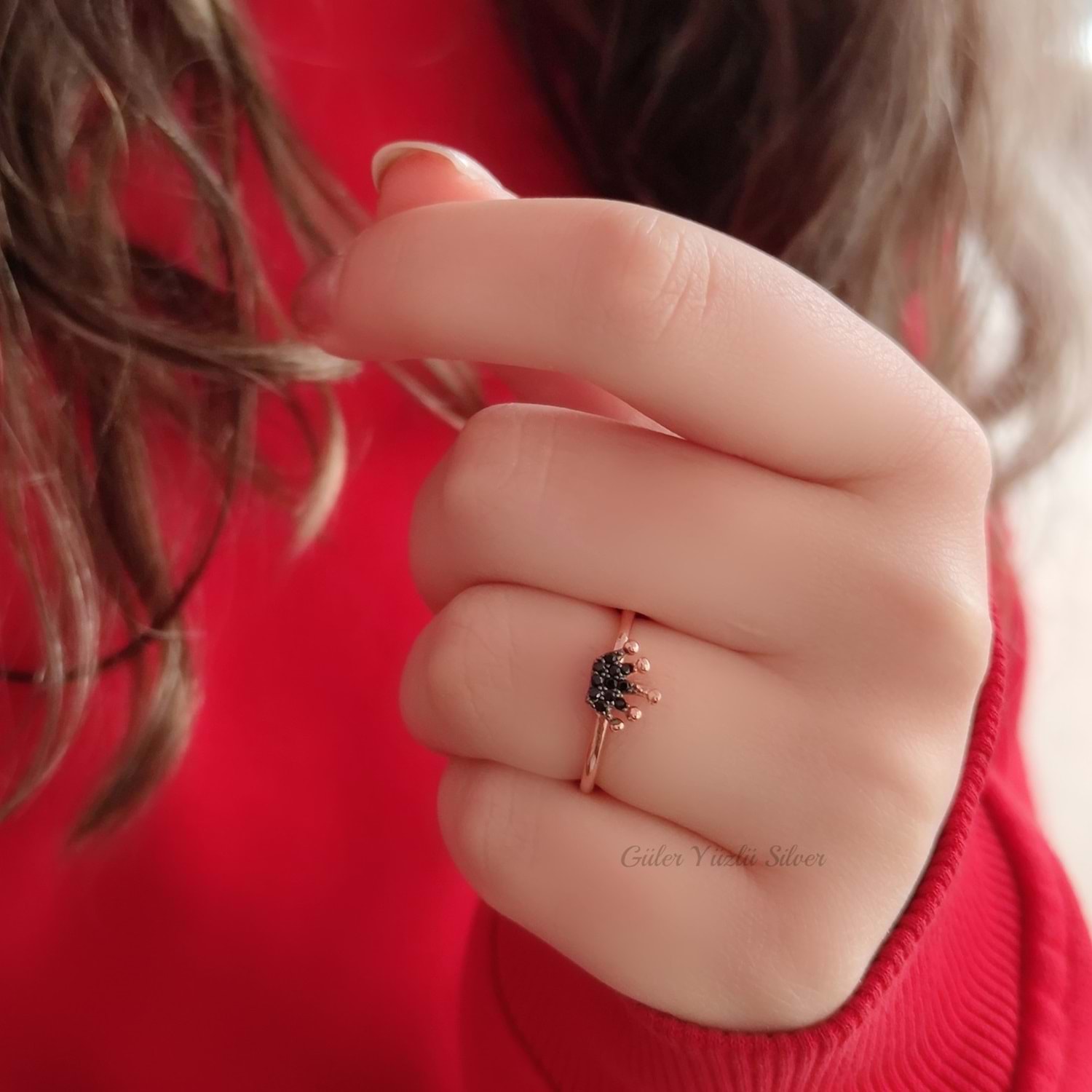 AYARLANABİLİR SİYAH TAŞLI TAÇ GÜMÜŞ YÜZÜK - ROSE ALTIN KAPLAMA
