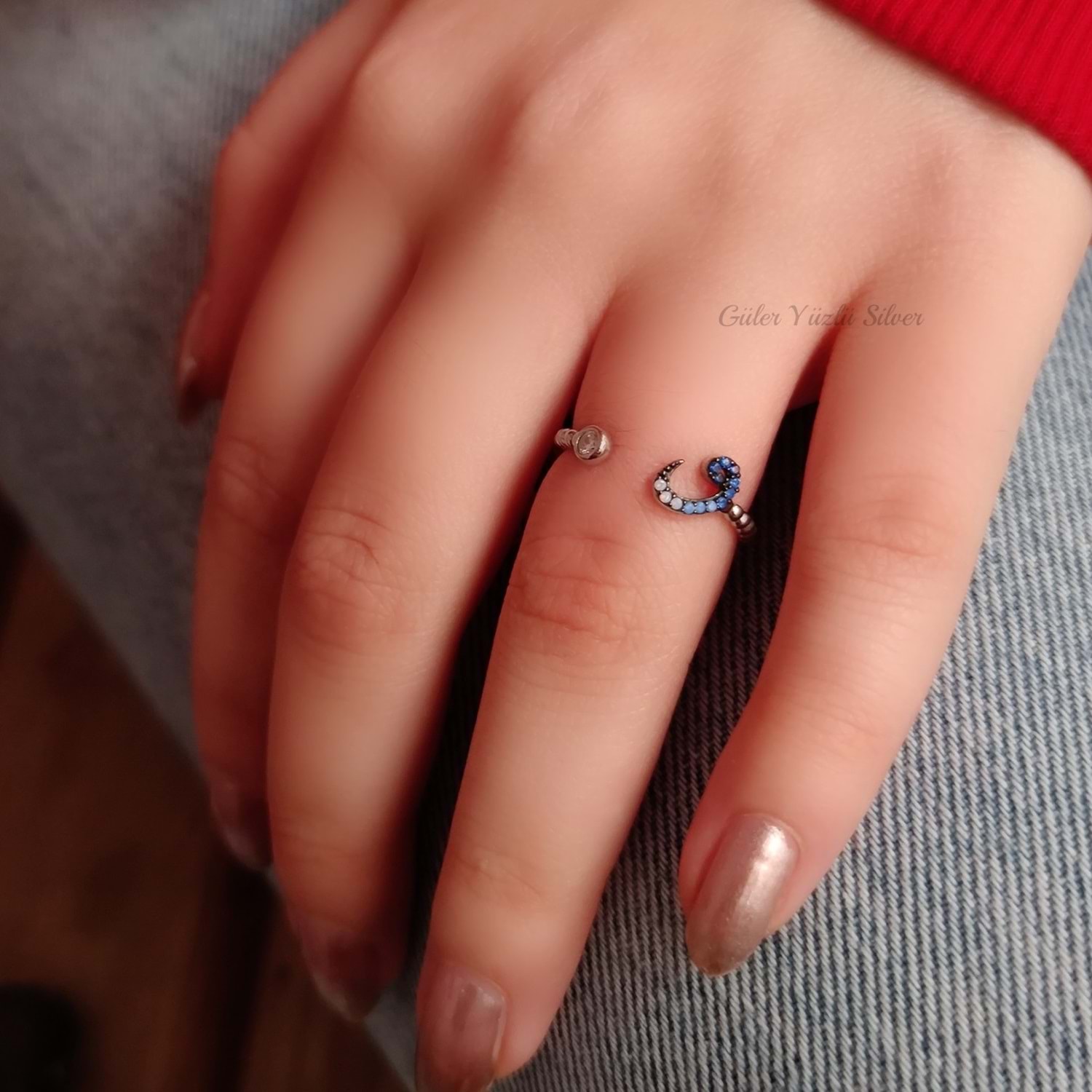 MAVİ TONLAMALI NANO TAŞLI AYARLANABİLİR VAV GÜMÜŞ YÜZÜK - RODYUM KAPLAMA