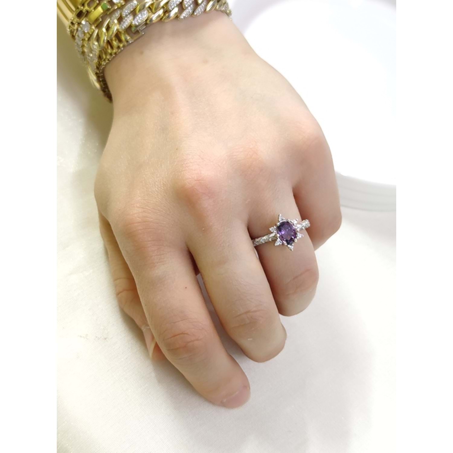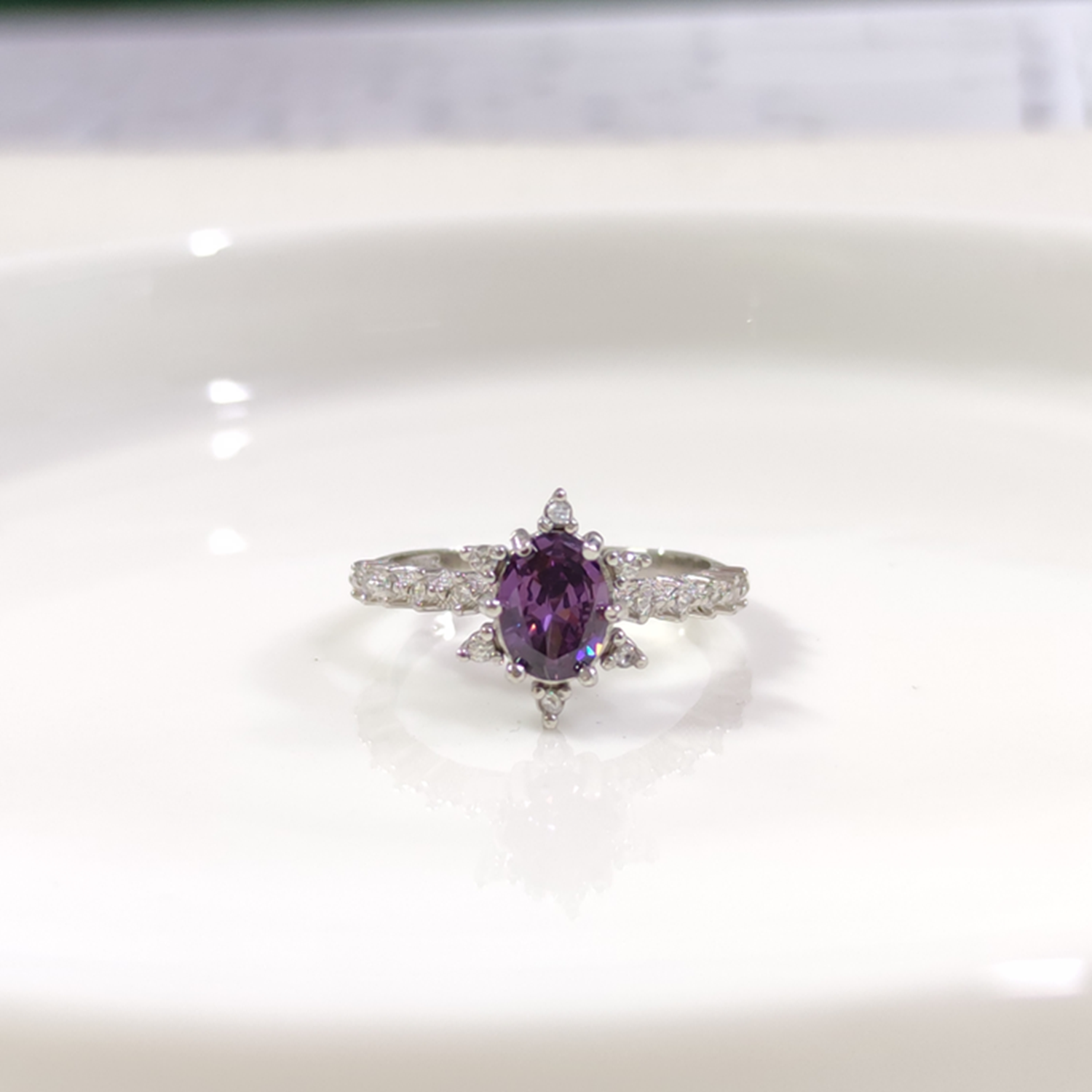 MOR OVAL TAŞLI ÇİÇEK LOTUS TEK TAŞ GÜMÜŞ YÜZÜK - 18