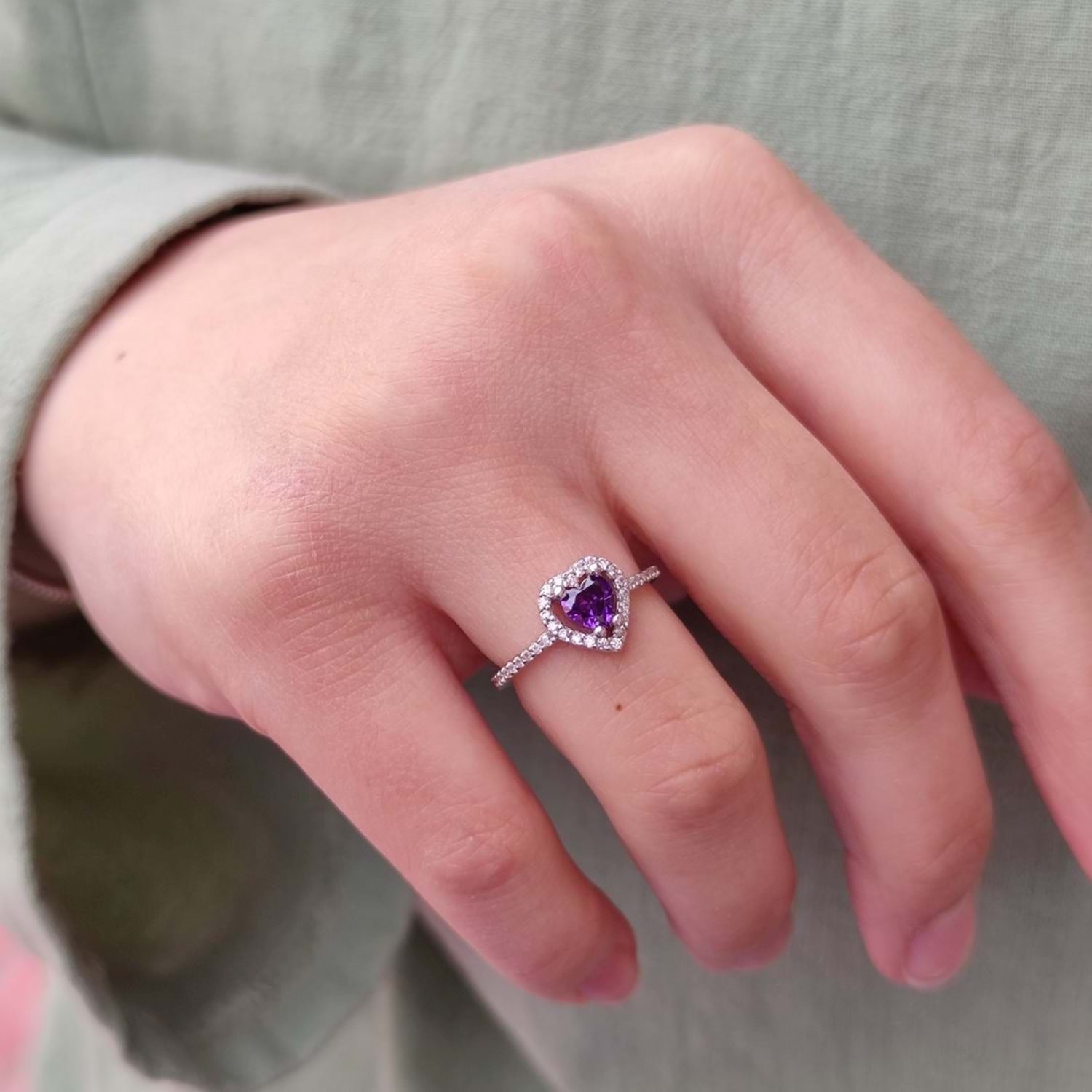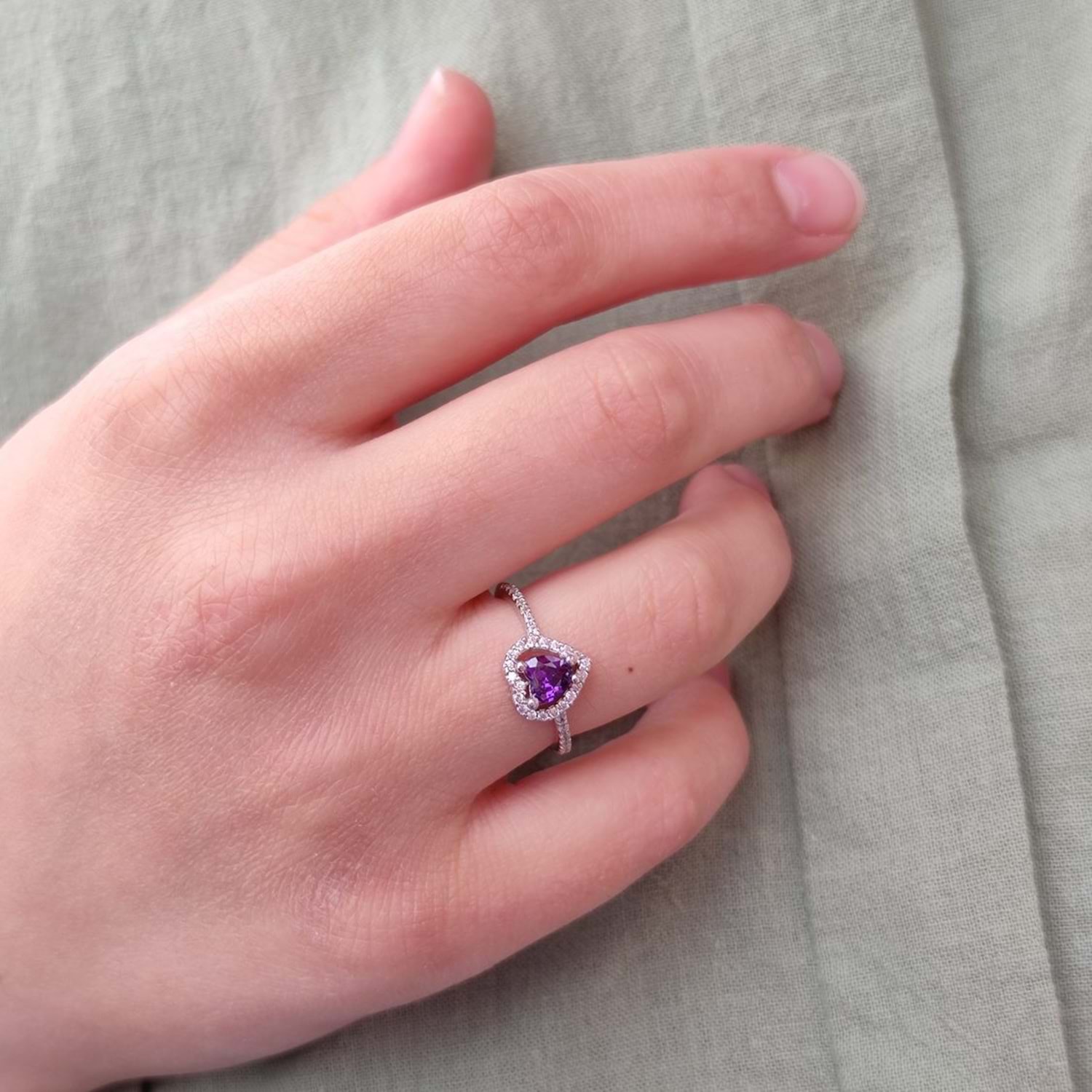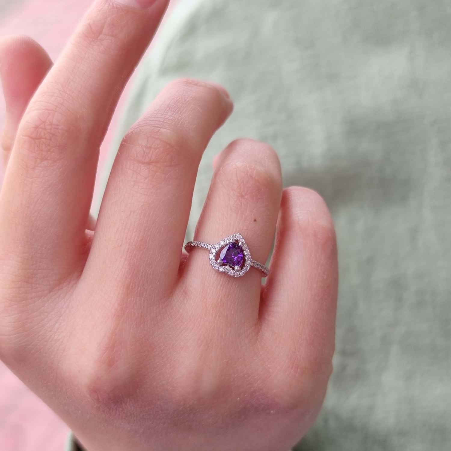 MOR TAŞLI MİNİ KALP GÜMÜŞ YÜZÜK - RODYUM BEYAZ - 12