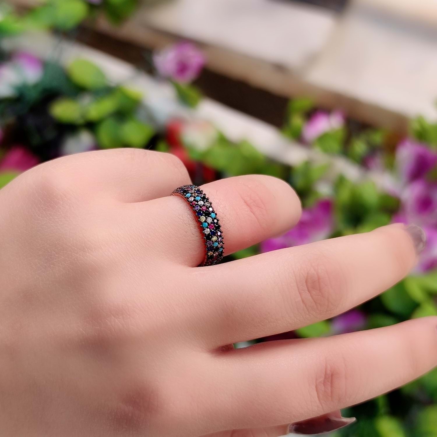 RODYUM ÜÇ SIRA MİX TAŞLI TAMTUR GÜMÜŞ YÜZÜK - 17