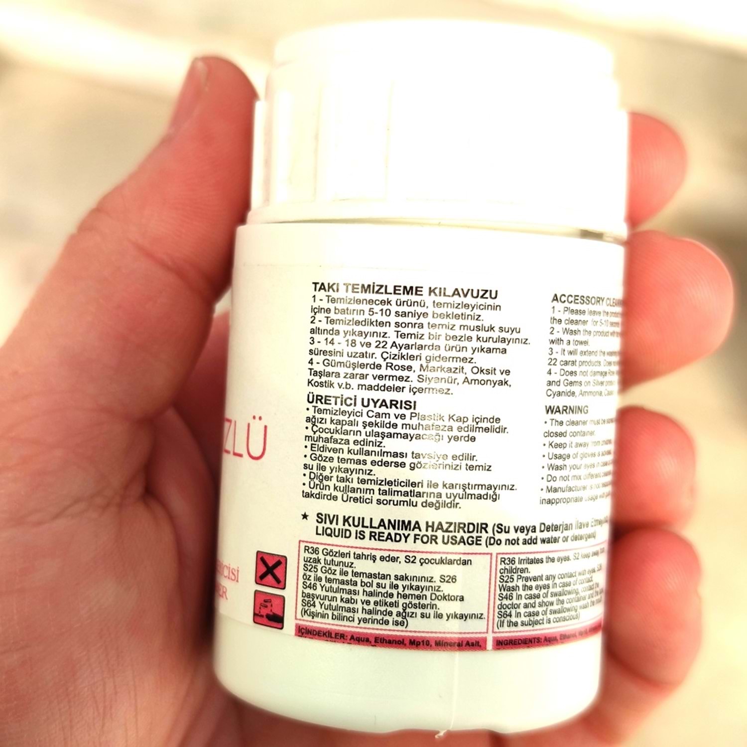 TAKI TEMİZLEME KILAVUZU : TEMİZLENECEK ÜRÜNÜ TEMİZLEYİCİNİN İÇİNE BANDIRIP 5-10 SANİYE BEKLETİN. EĞER ÜRÜN ROSE YA DA ALTIN KAPLAMA İSE 1-2 SANİYE BEKLETİLMELİDİR.