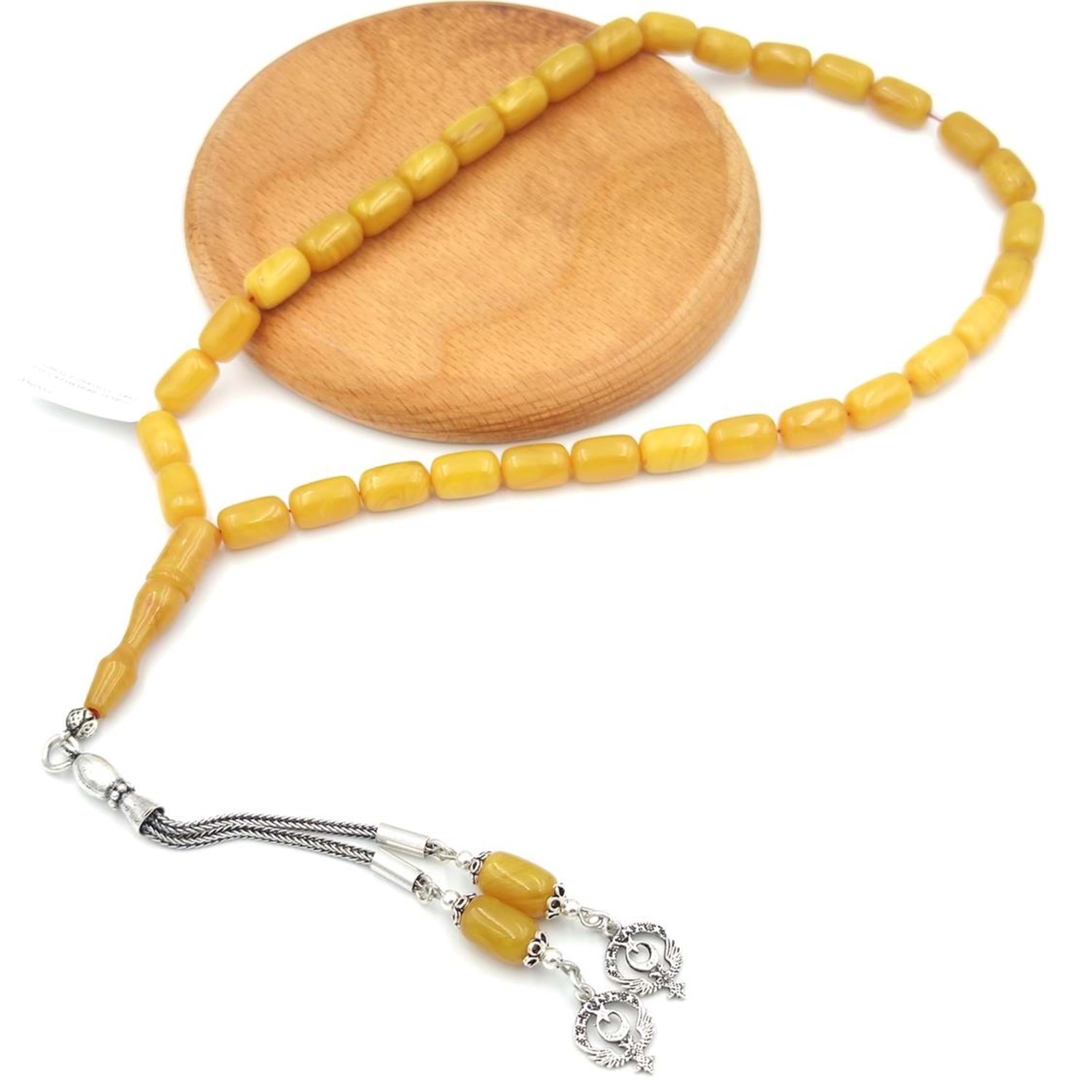 MADDESİ Ateş Kehribar, PÜSKÜLÜ 925 AYAR GÜMÜŞTÜR KESİMİ Kapsül, RENK Mavi, Zübeyir BALKAYA Usta İşçilikli Ateş Kehribar Tesbih Sıkma Kehribar Osmanlı zamanından beri tesbih yapımında kullanılan fenol bazlı bir malzemedeir. Özellikle ilçemizde üretilen çubuk sıkma kehribarlar 1800 lerin sonunda kapatılan fabrikadaki malzeme kalitesine yakındır. Osmaniye'nin Bahçe ilçesinde sıkma kehribar ve katalin tesbihler başta olmak üzere 40'a yakın tesbih atölyesi bulunmaktadır. Sıkma kehribar tesbihlerin de küre, kapsül, beyzi, tekerlek ve kesme şeklinde modelleri bulunmaktadır.