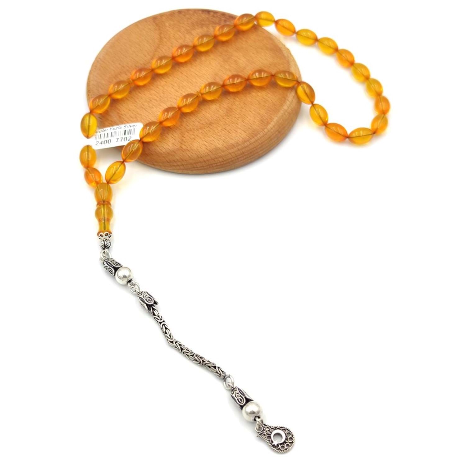 MADDESİ Ateş Kehribar, KESİMİ BEYZİ PÜSKÜL : 925 AYAR GÜMÜŞ RENK SARI, Sıkma Kehribar Osmanlı zamanından beri tesbih yapımında kullanılan fenol bazlı bir malzemedeir. Özellikle ilçemizde üretilen çubuk sıkma kehribarlar 1800 lerin sonunda kapatılan fabrikadaki malzeme kalitesine yakındır. Osmaniye'nin Bahçe ilçesinde sıkma kehribar ve katalin tesbihler başta olmak üzere 40'a yakın tesbih atölyesi bulunmaktadır. Sıkma kehribar tesbihlerin de küre, kapsül, beyzi, tekerlek ve kesme şeklinde modelleri bulunmaktadır.