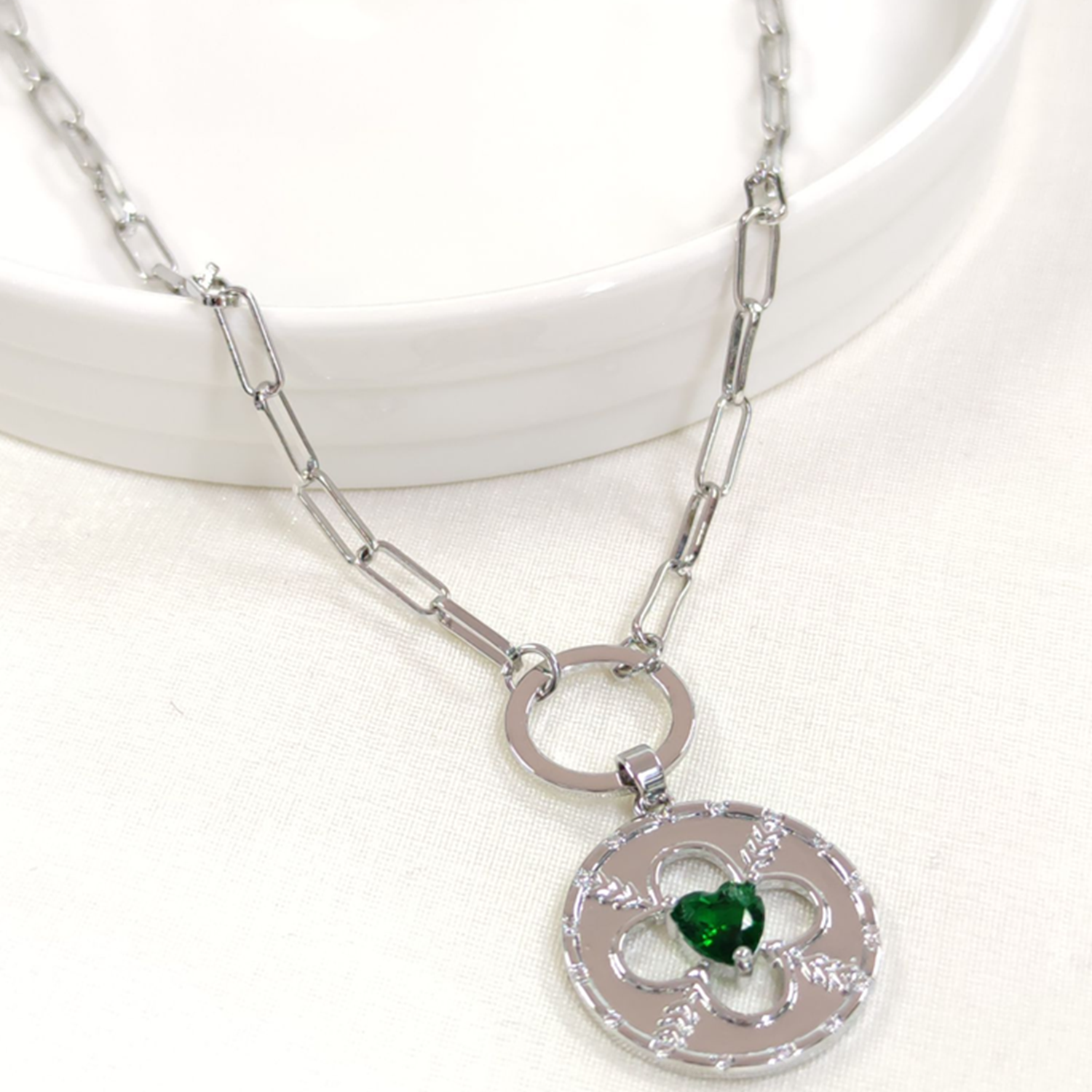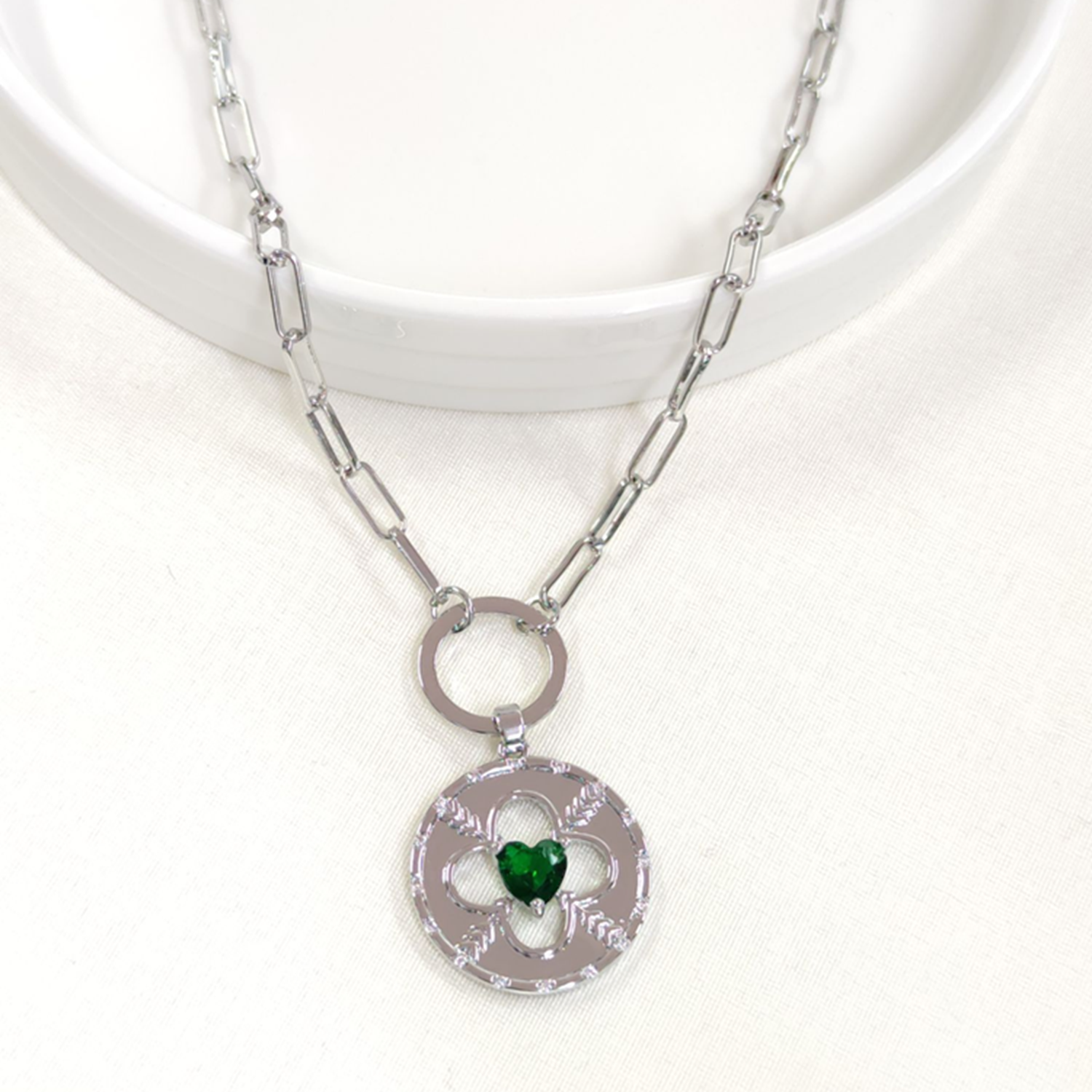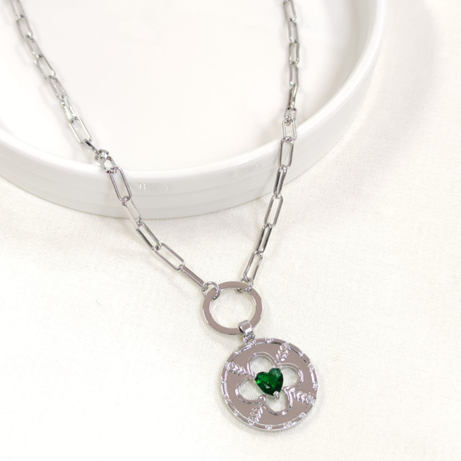FULLYX YEŞİL TAŞLI PLAKA YONCA KOLYE 52+5 CM - BEYAZ
