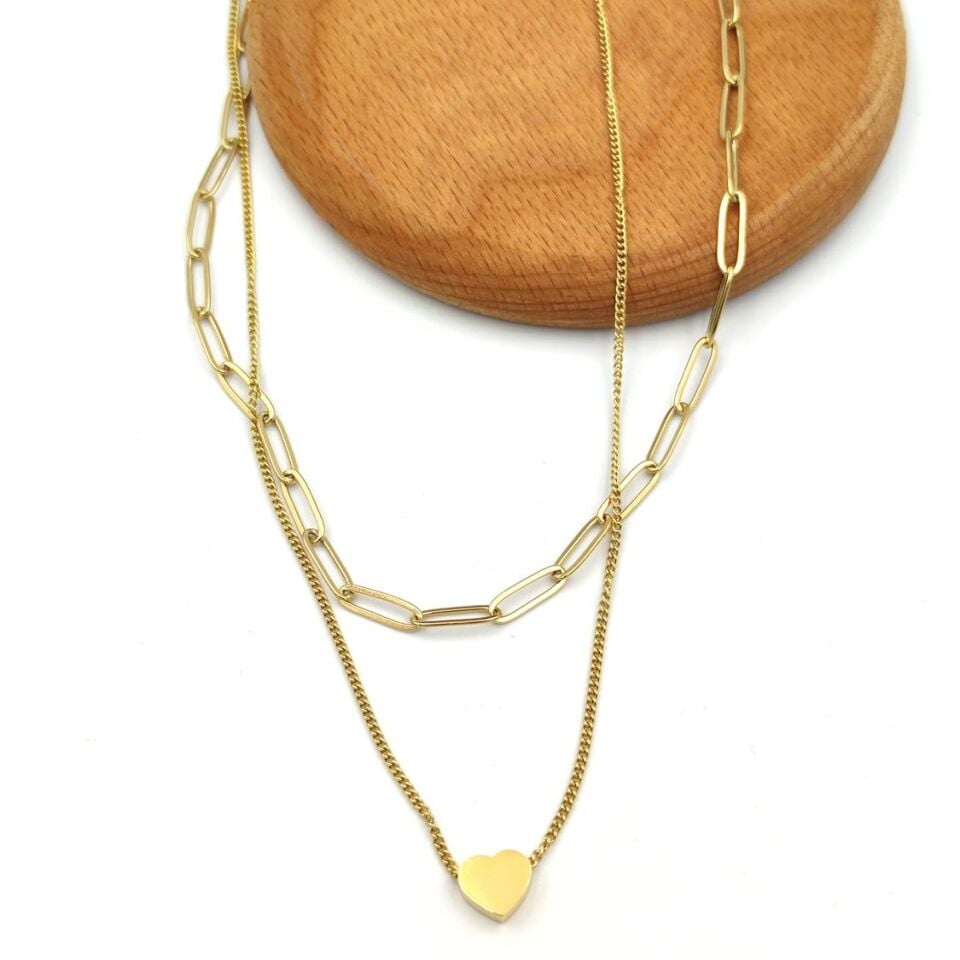 İKİ SIRA ATAÇ ZİNCİRLİ KALP ÇELİK KOLYE