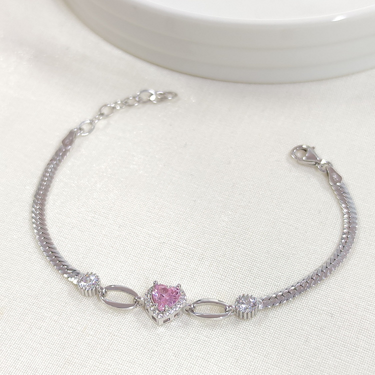YASSI ZİNCİRLİ TAŞLI PEMBE KALP GÜMÜŞ BİLEKLİK 16 CM+3